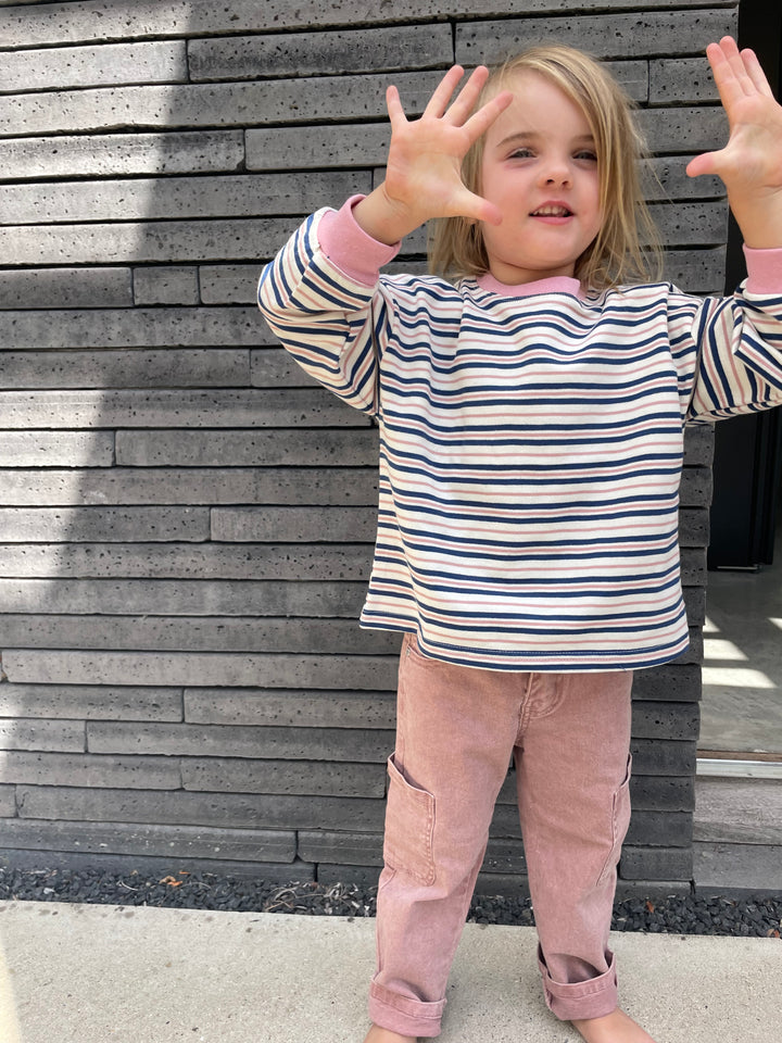 Goed om te weten: de broek heeft een rits en nepknop (verborgen schuivertje + eentje extra bijgeleverd mocht die sneuvelen). De broek heeft ook pasbare rekkertjes binnenin zodat de broek ook past voor de fijne kindjes onder ons. Lucie wordt 4 jaar in november en draagt op de foto maatje 104