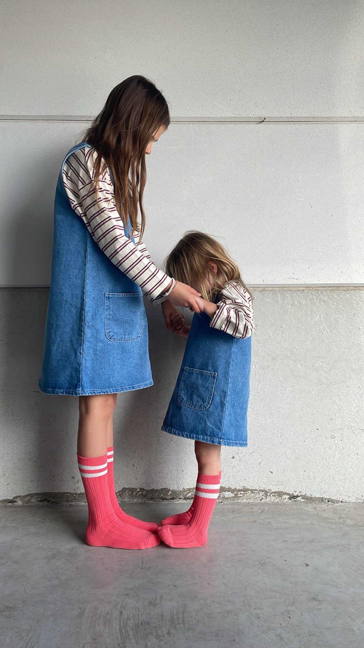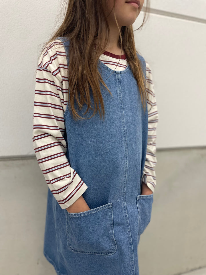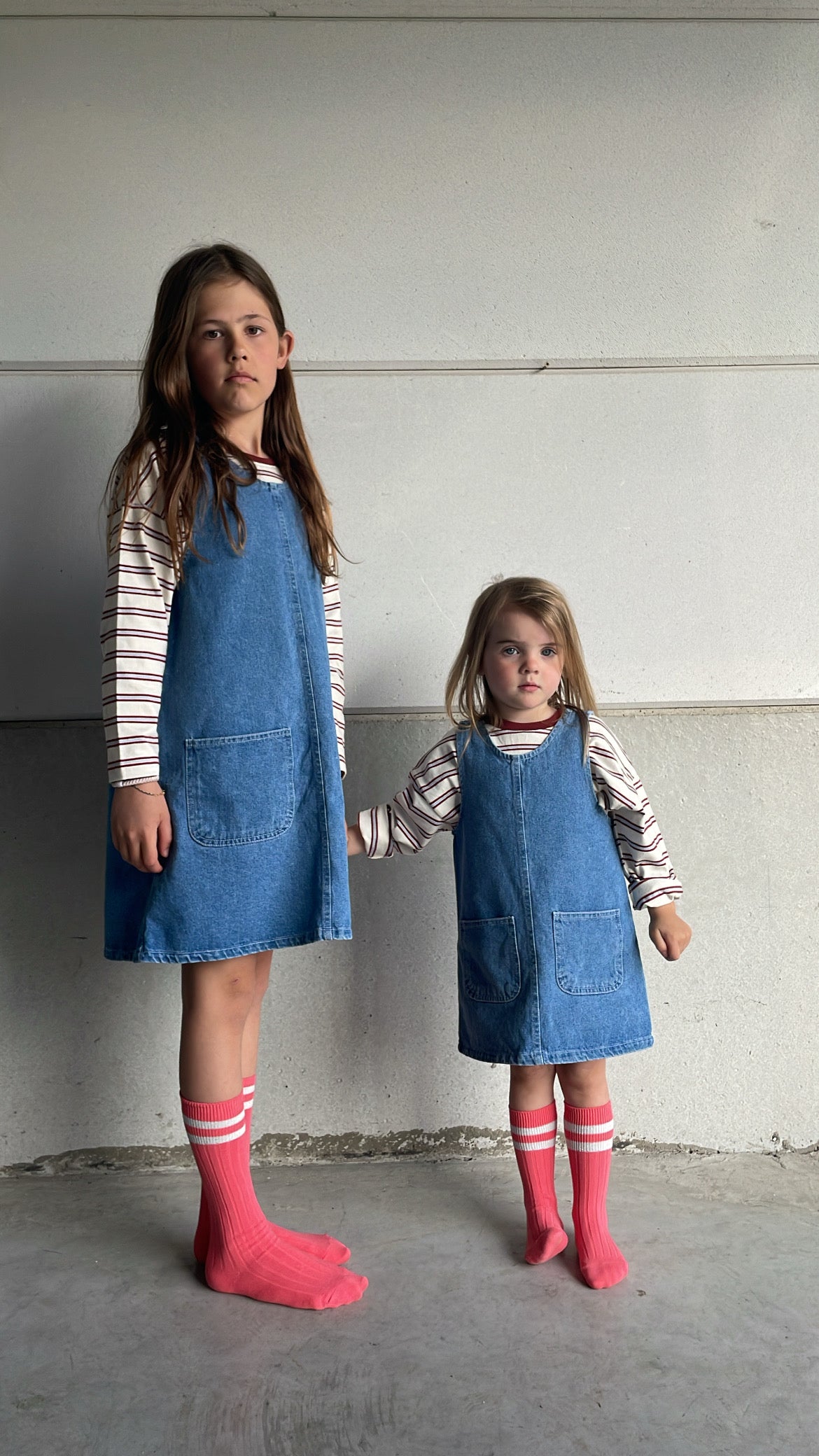 Heerlijk jeanskleedje voor jong en oud! Lucie is 3 jaar en draagt maat S. Jools is 10 jaar en draagt maat JM