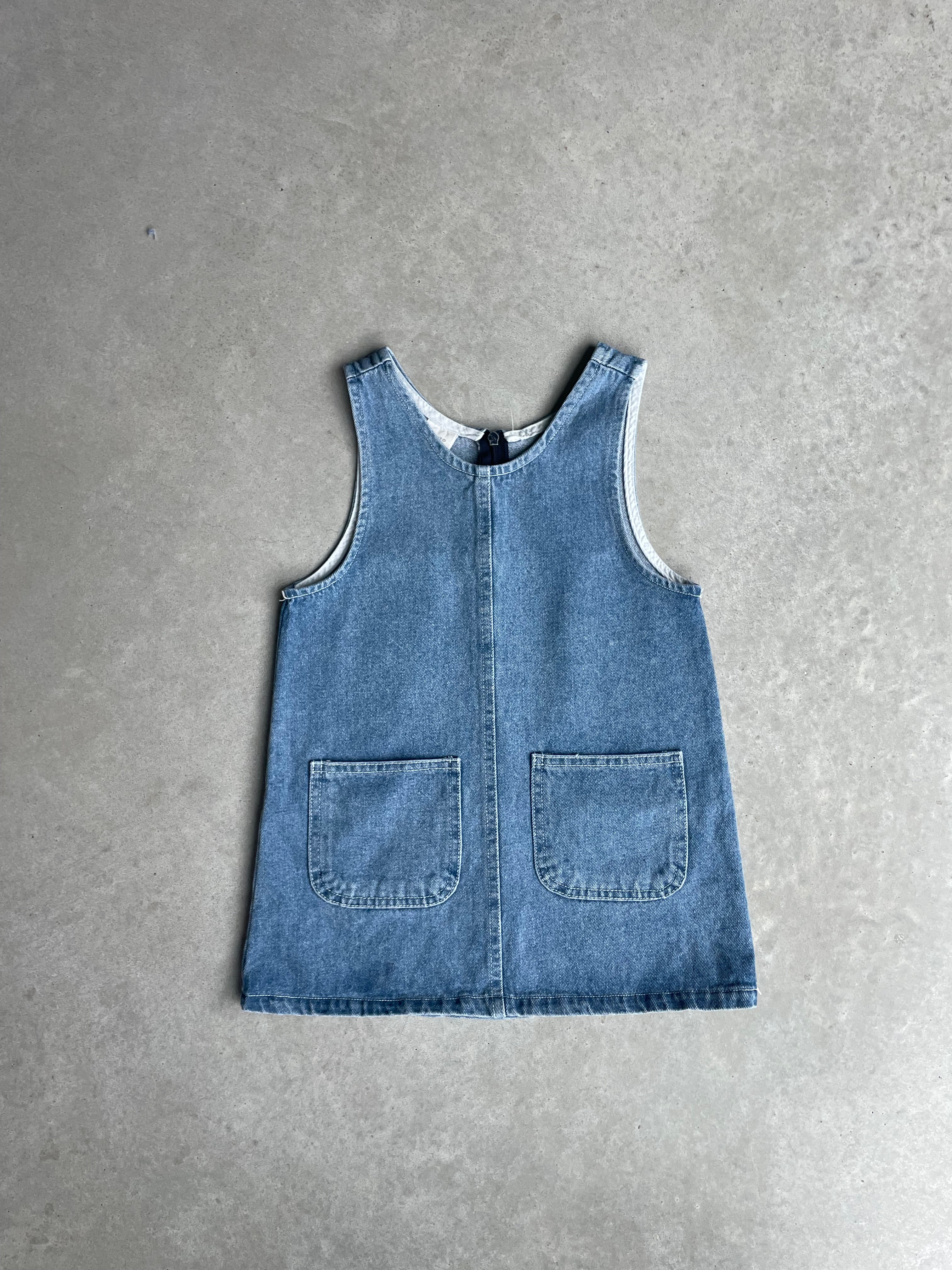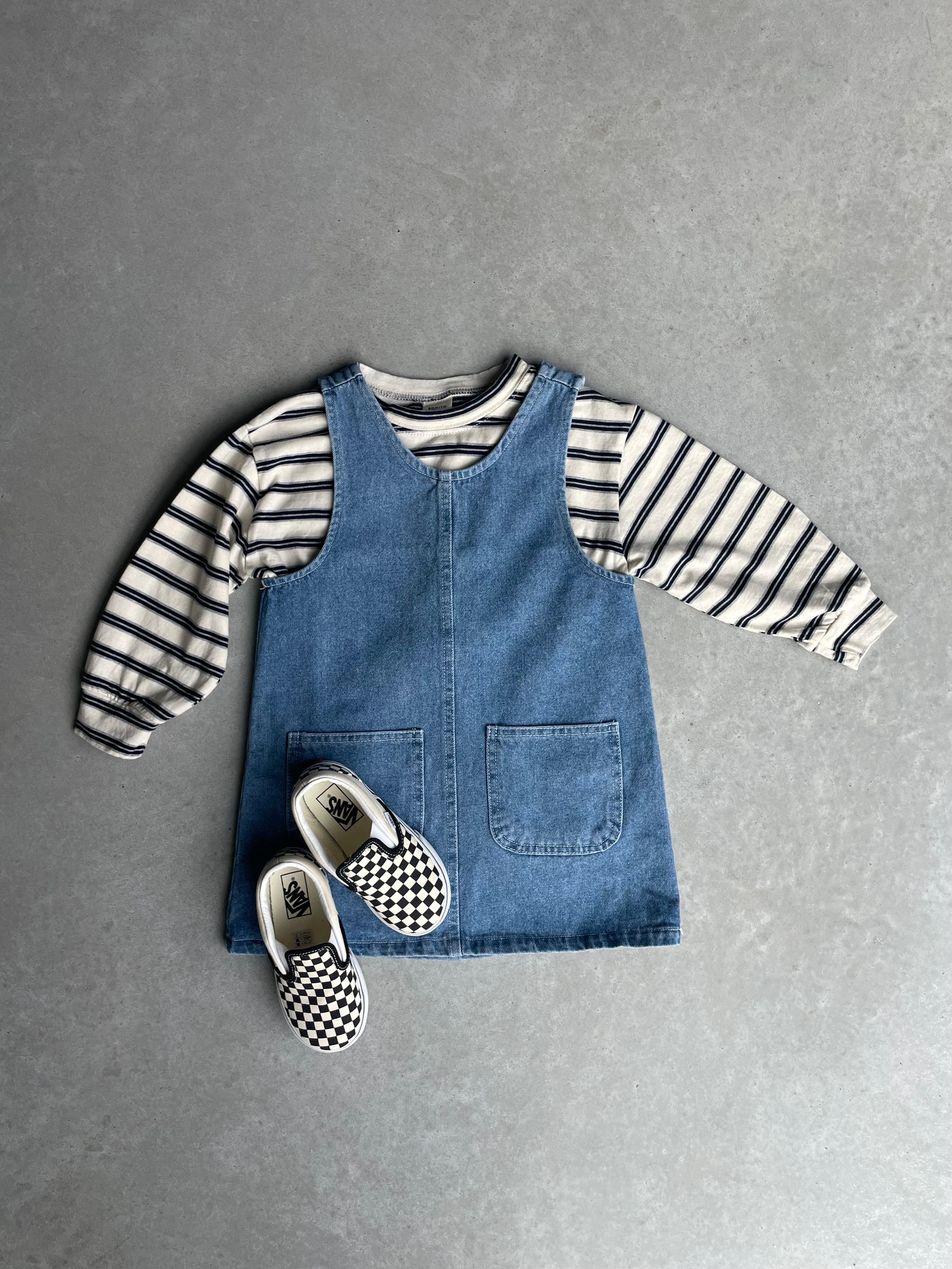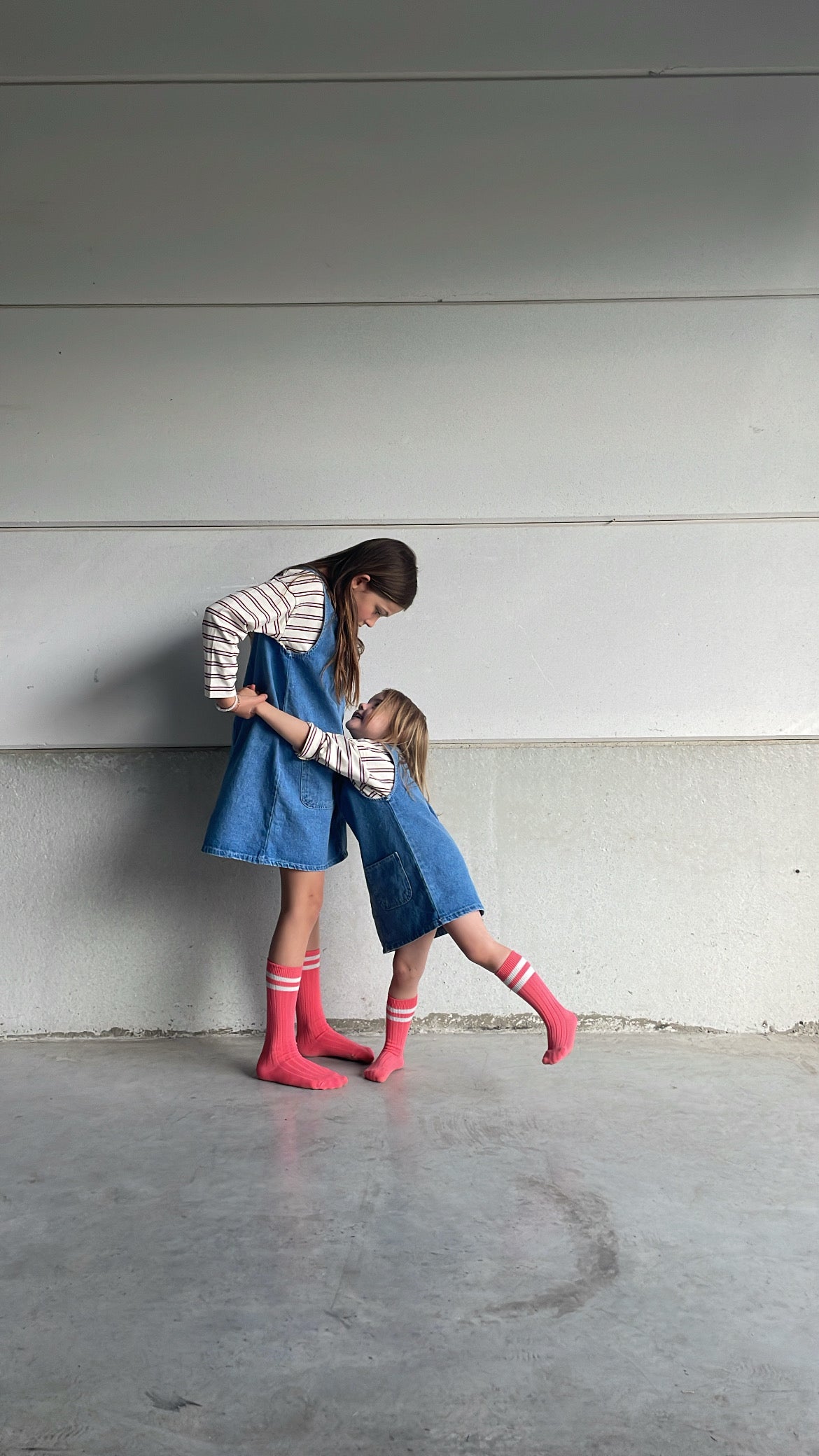 Heerlijk jeanskleedje voor jong en oud! Lucie is 3 jaar en draagt maat S. Jools is 10 jaar en draagt maat JM