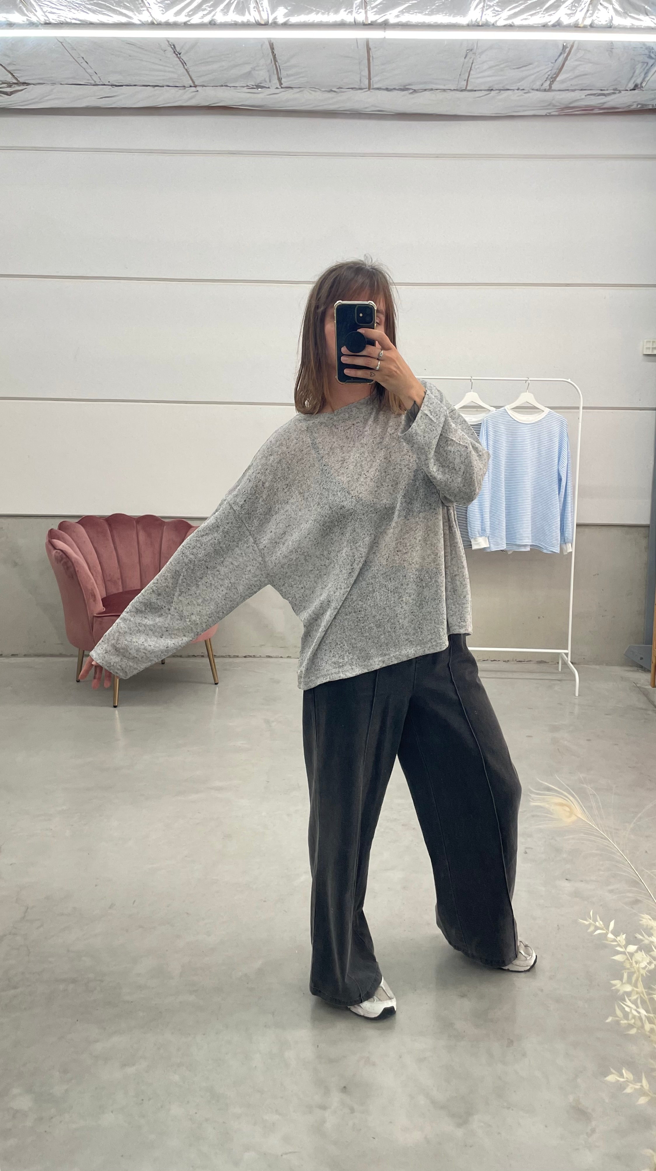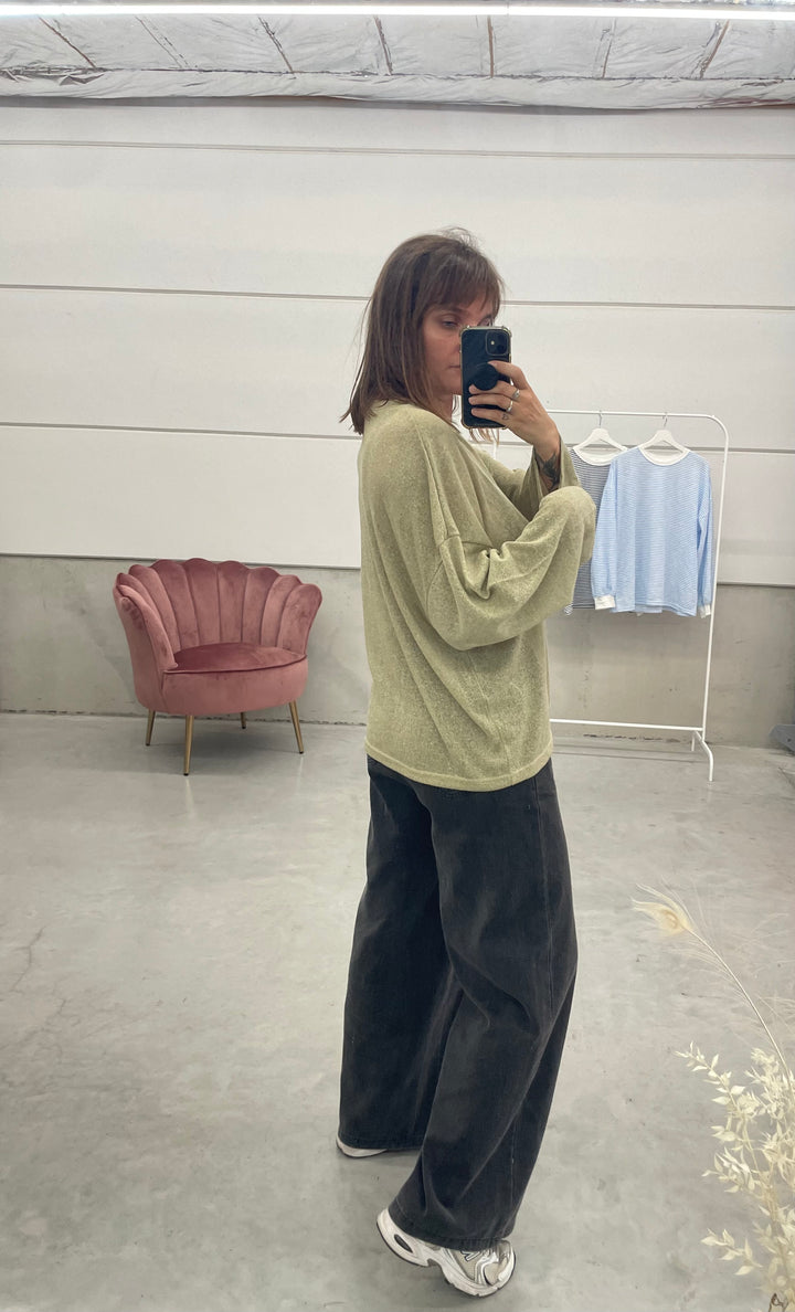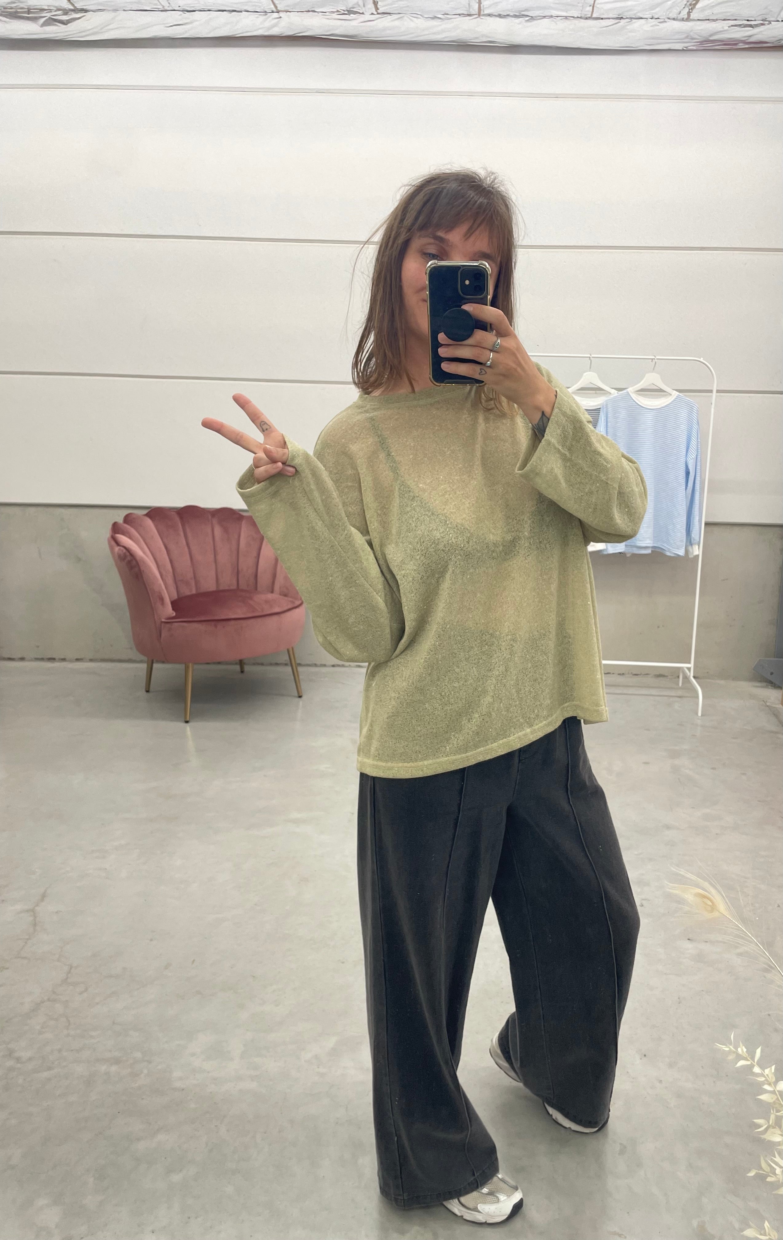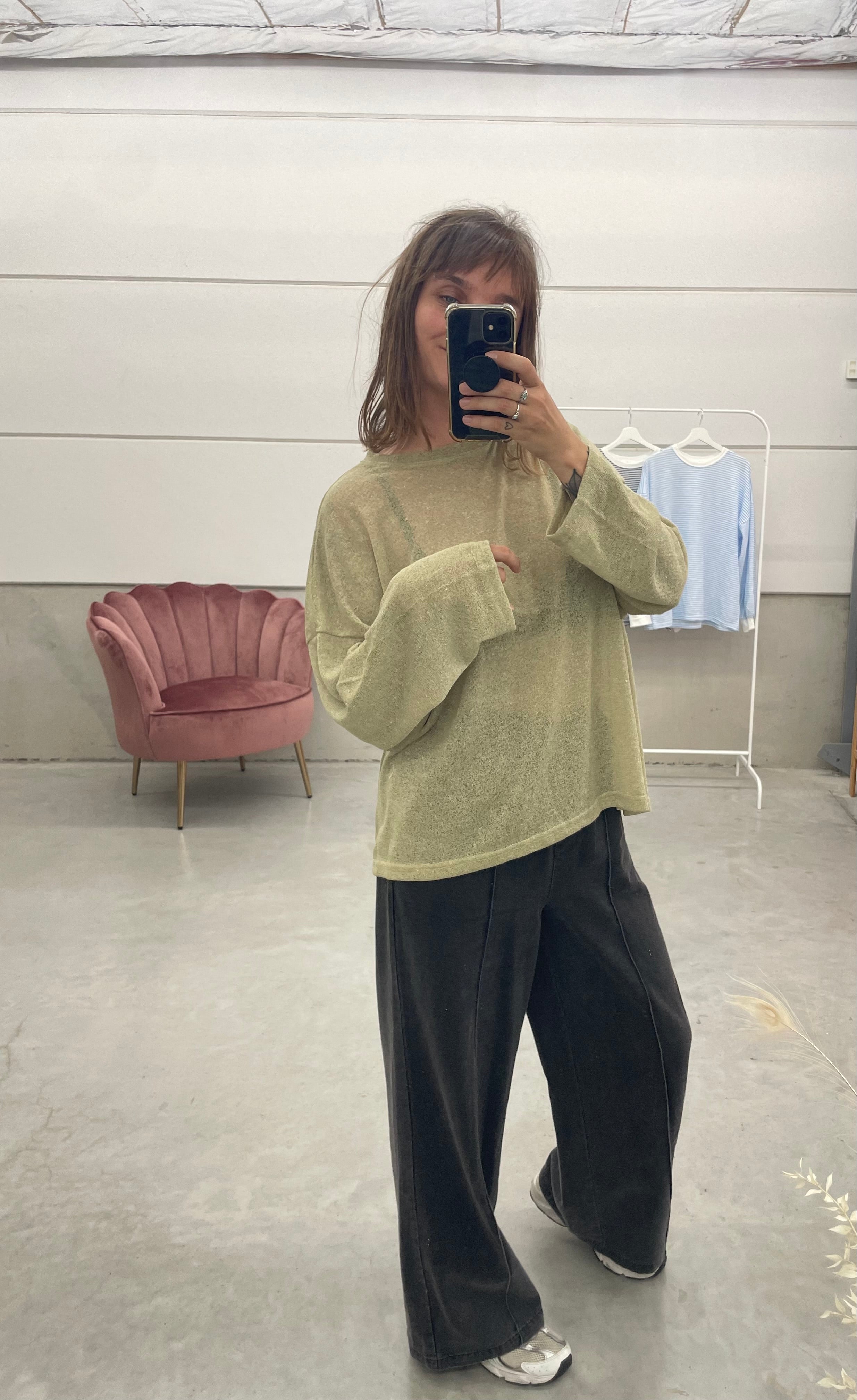 Dun luchtig truitje in lichtgrijs en lichtkaki. One size (past van 34 tot 42)