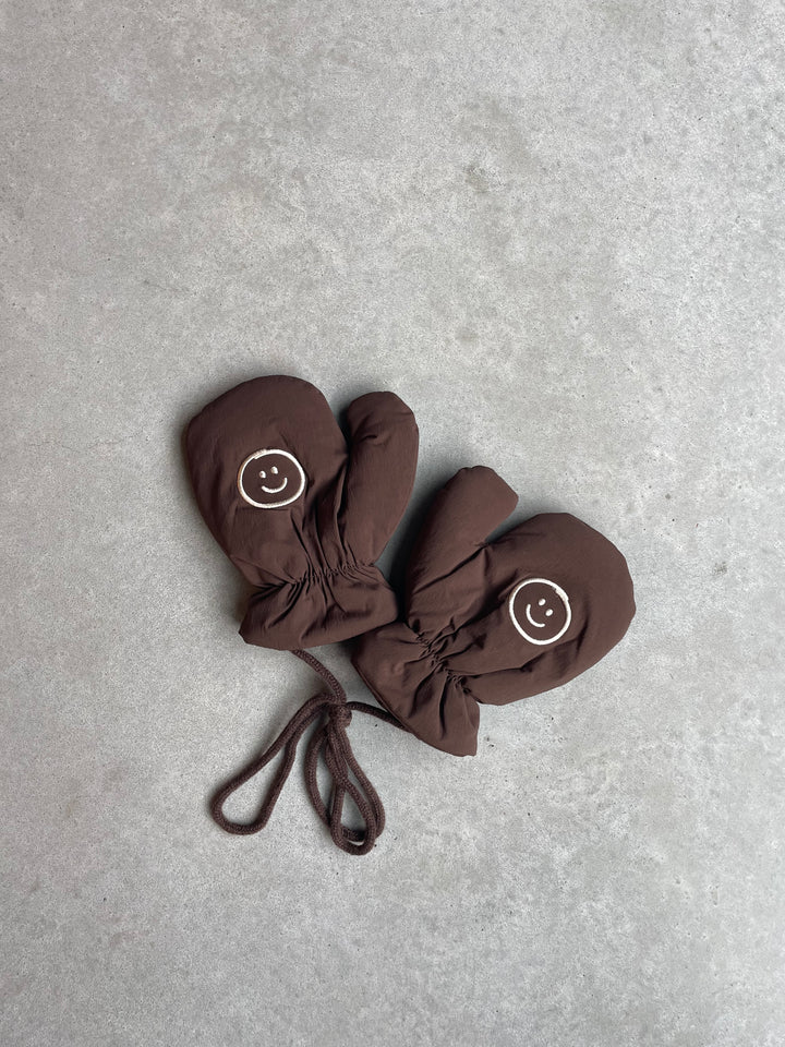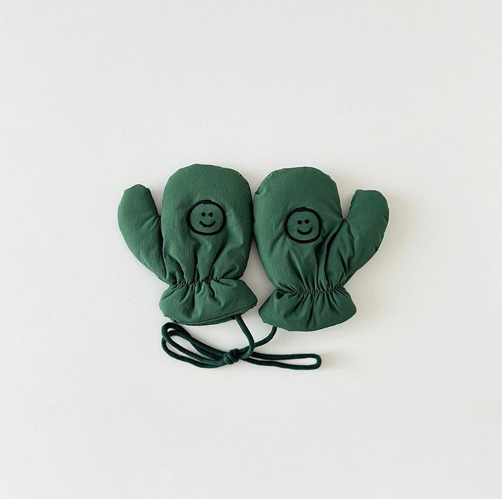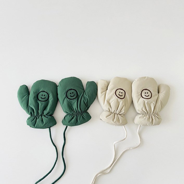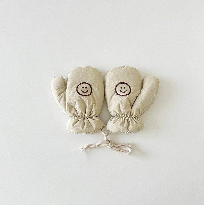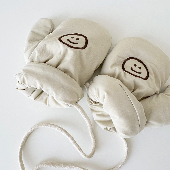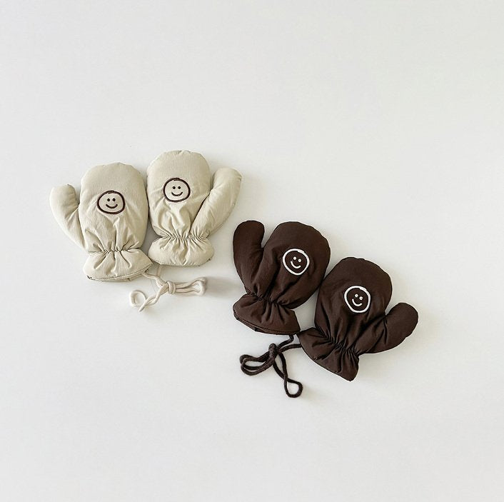 Zalige smiley wanten om de handjes van je kindje lekker warm te houden ♡ Met een handig koordje.