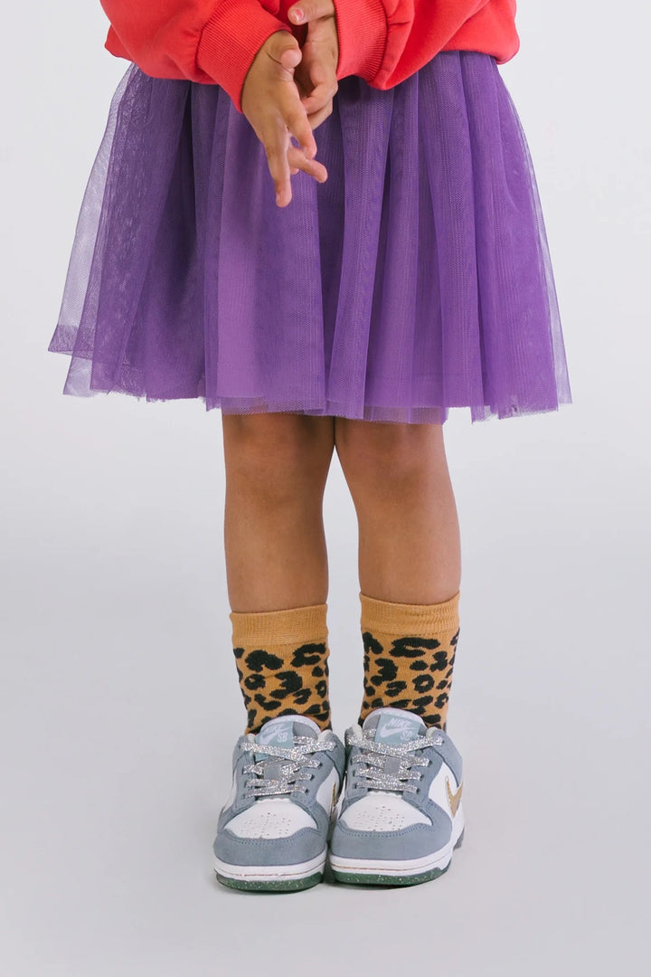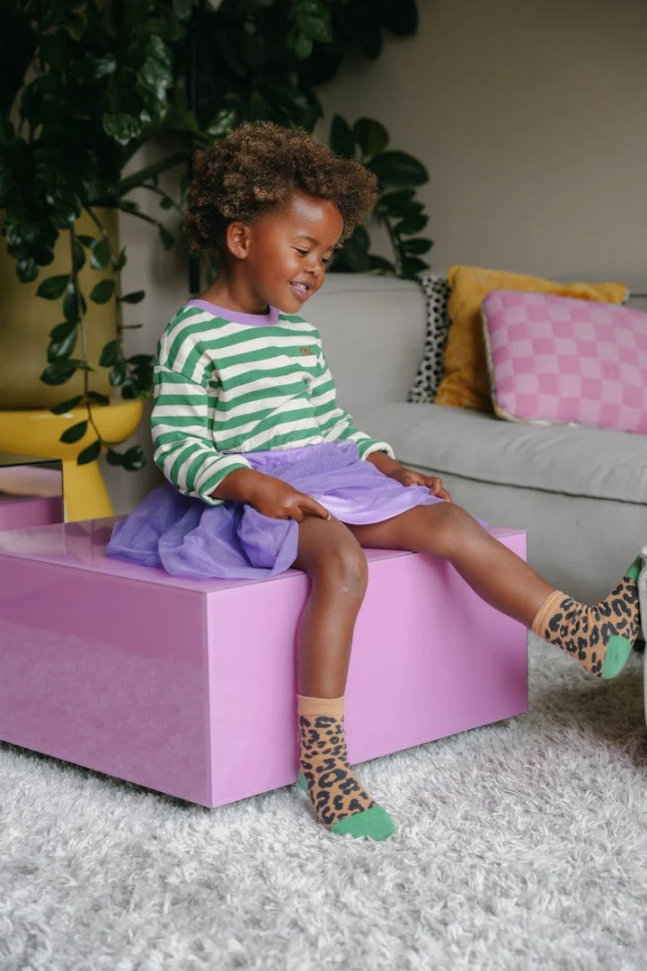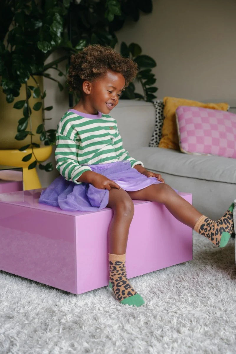 Súperleuke sokjes in mooie luipaardprint, met subtiele groene accenten op de tenen en hiel. Voor kindervoetjes van maat 23 tot en met 34.