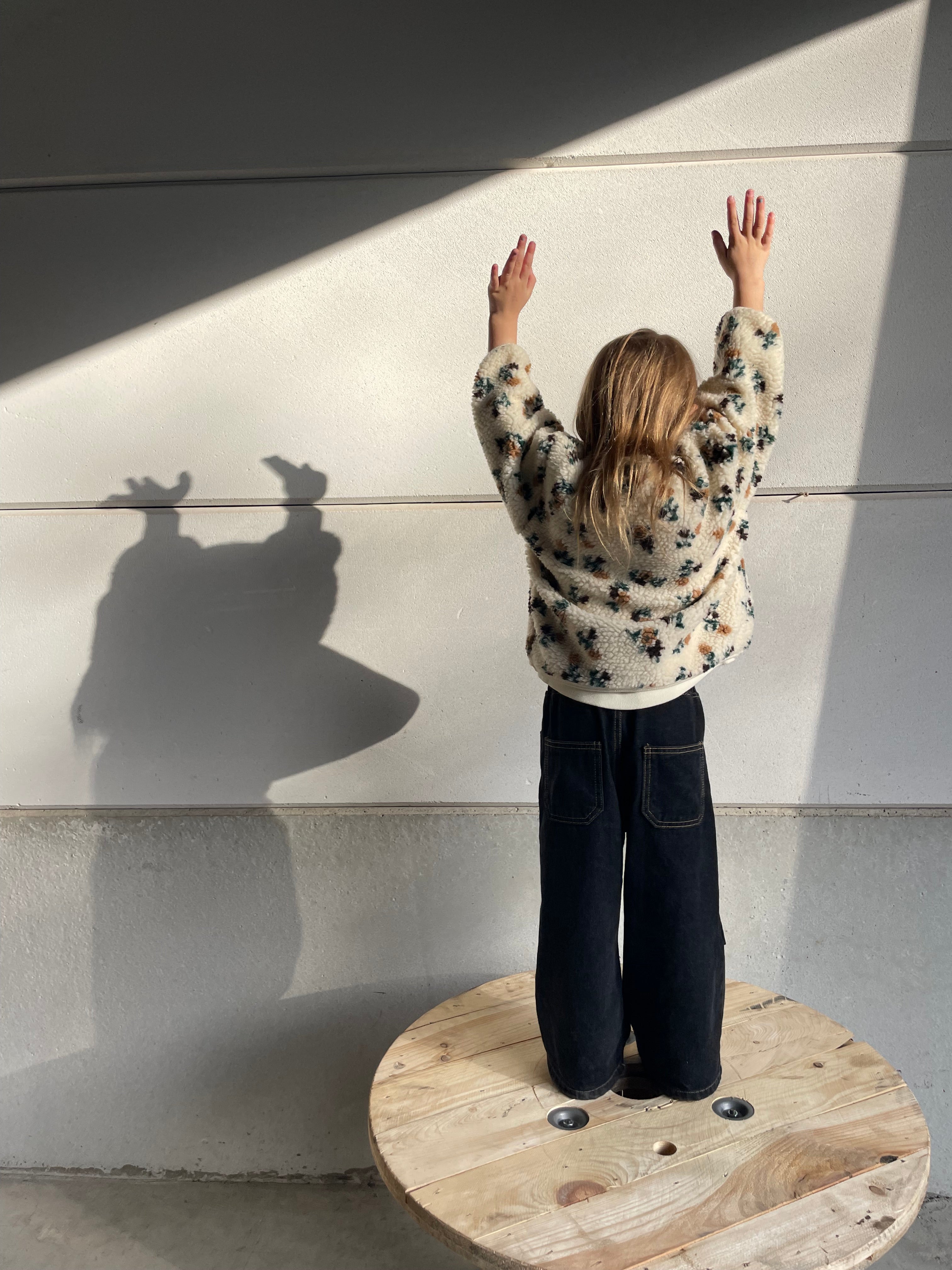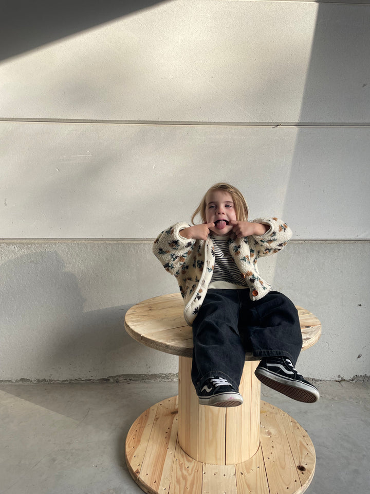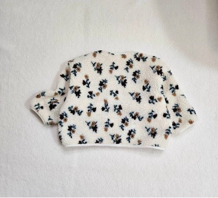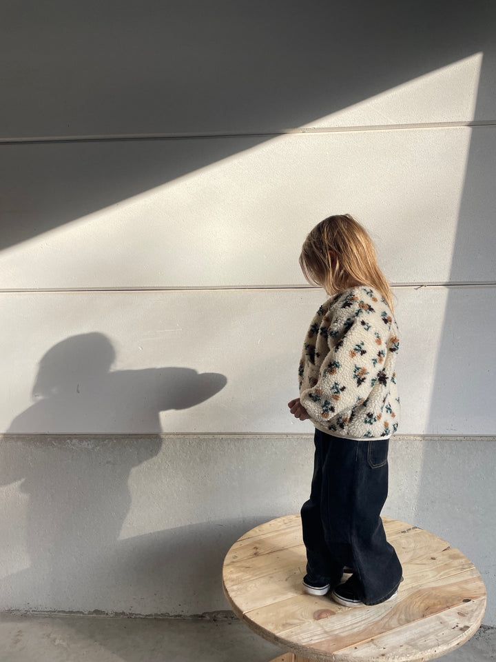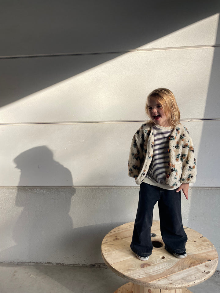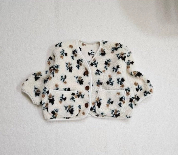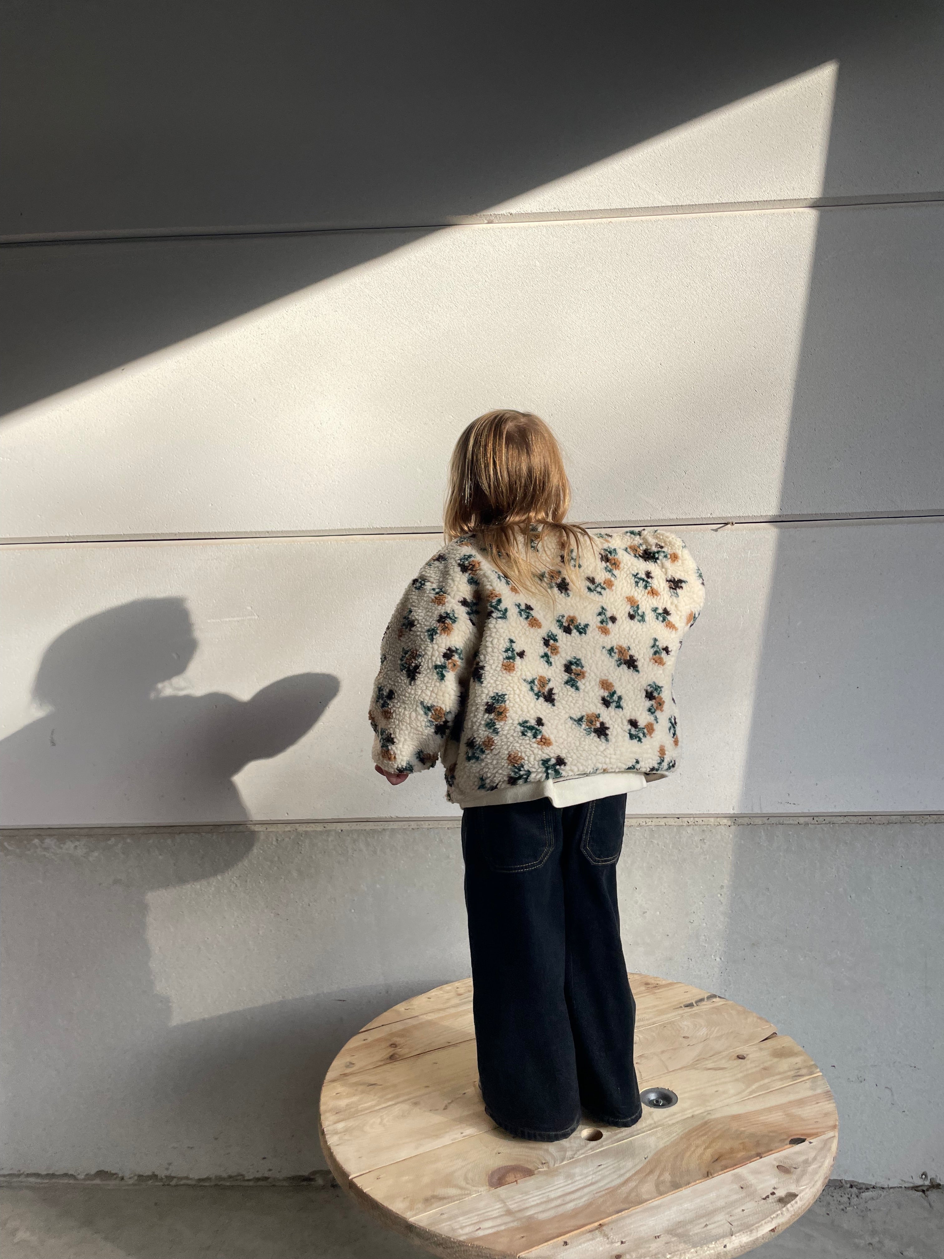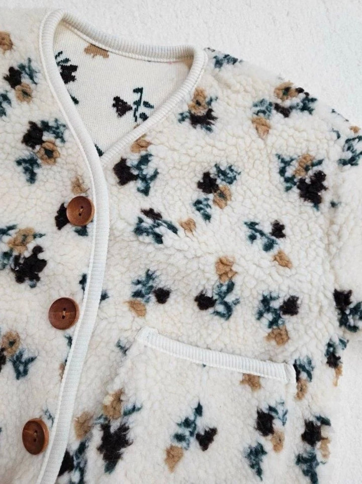 Nog een mooi teddyjasje is deze crèmekleurige flower jacket met drie knopen.