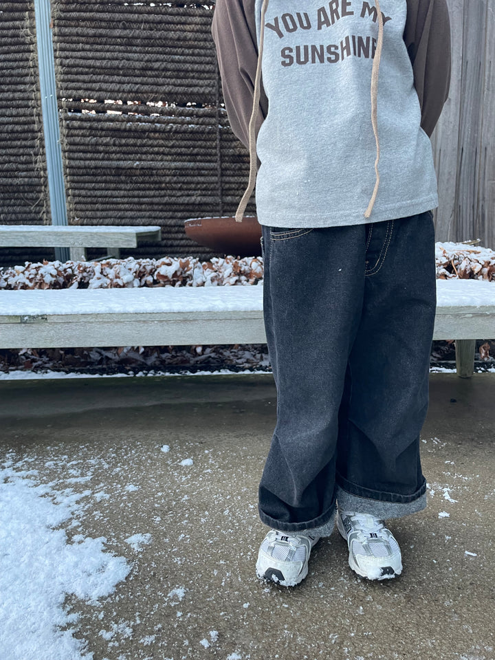 Een mooie loose fit jeansbroek met een heel fijn gevoerd laagje binnenin, om die herfst en winter ietsje zachter en warmer te trotseren ♡ extra touch met een omgeplooide pijp. Beschikbaar in donkerblauw en zwart.