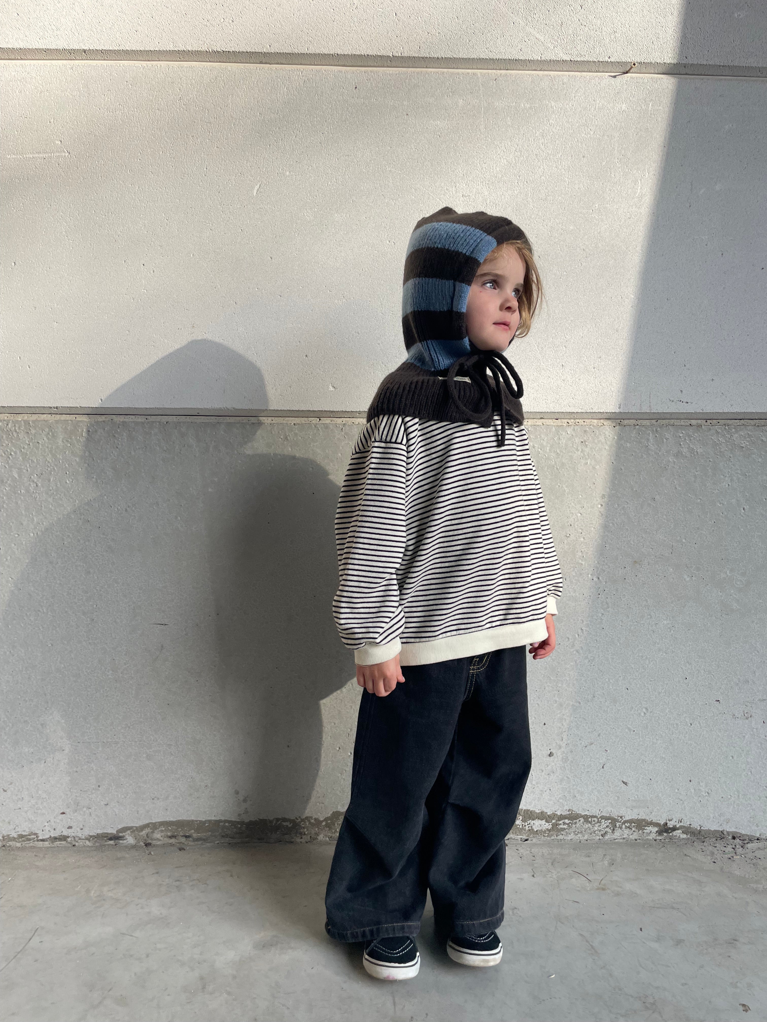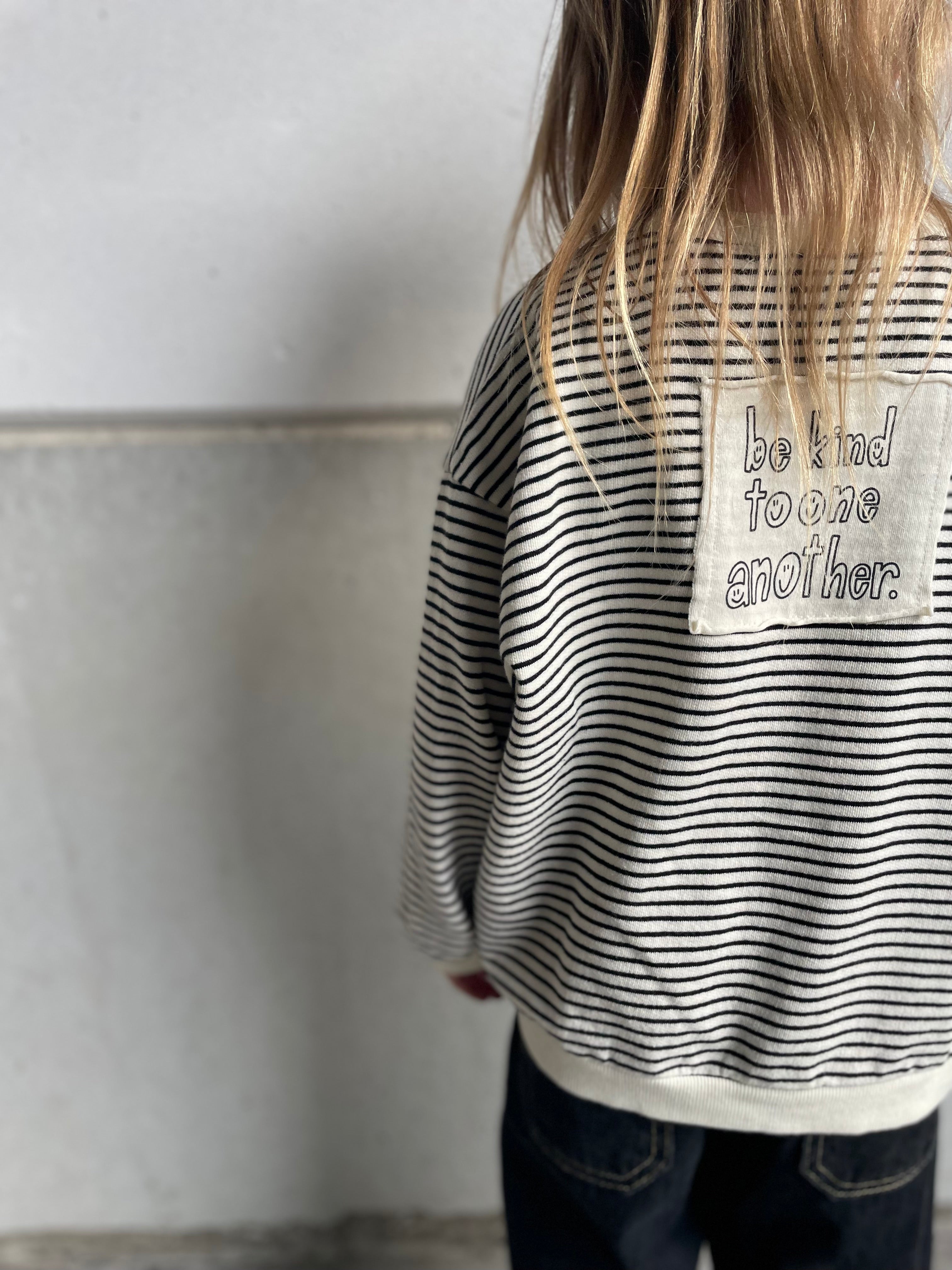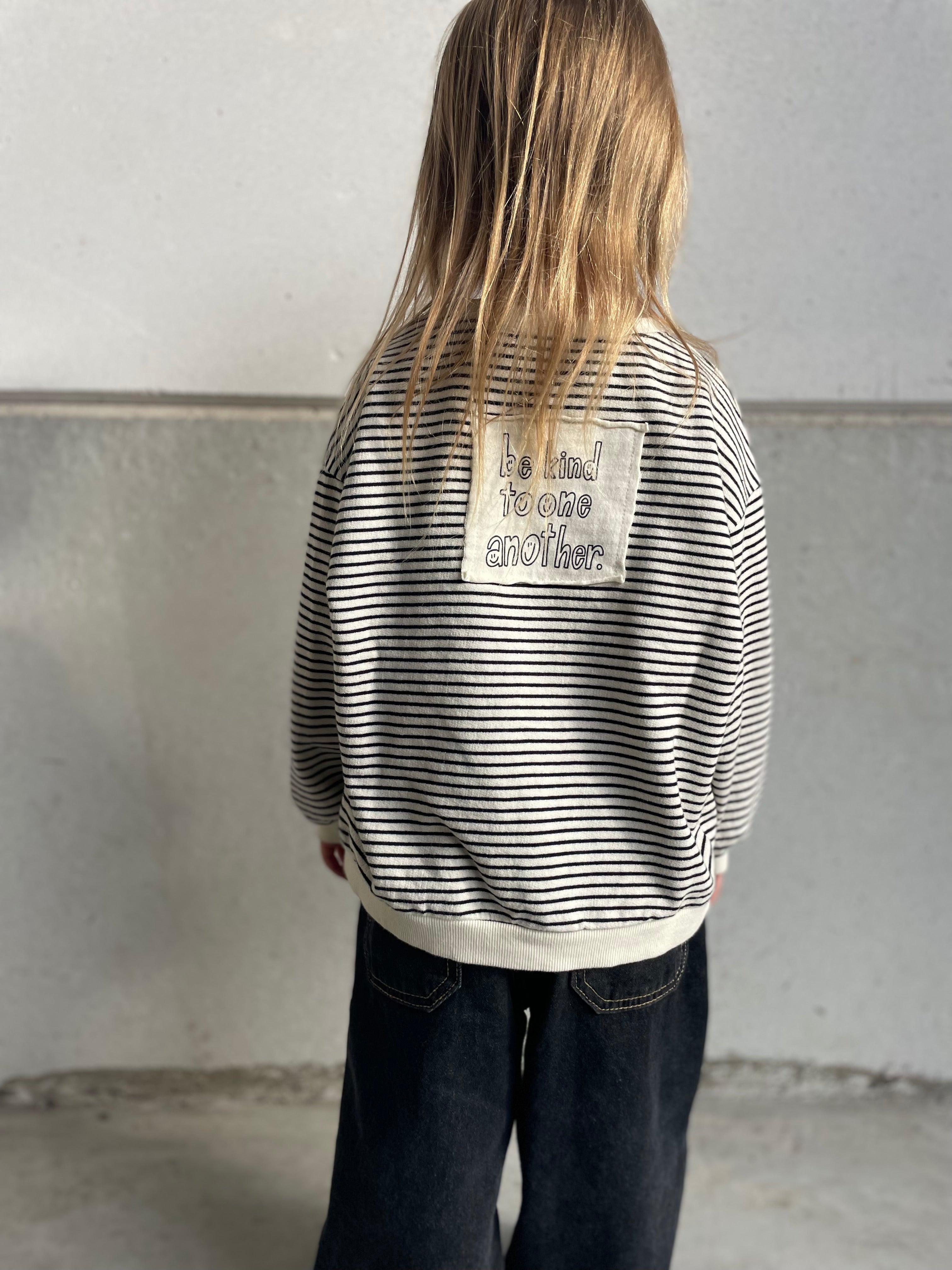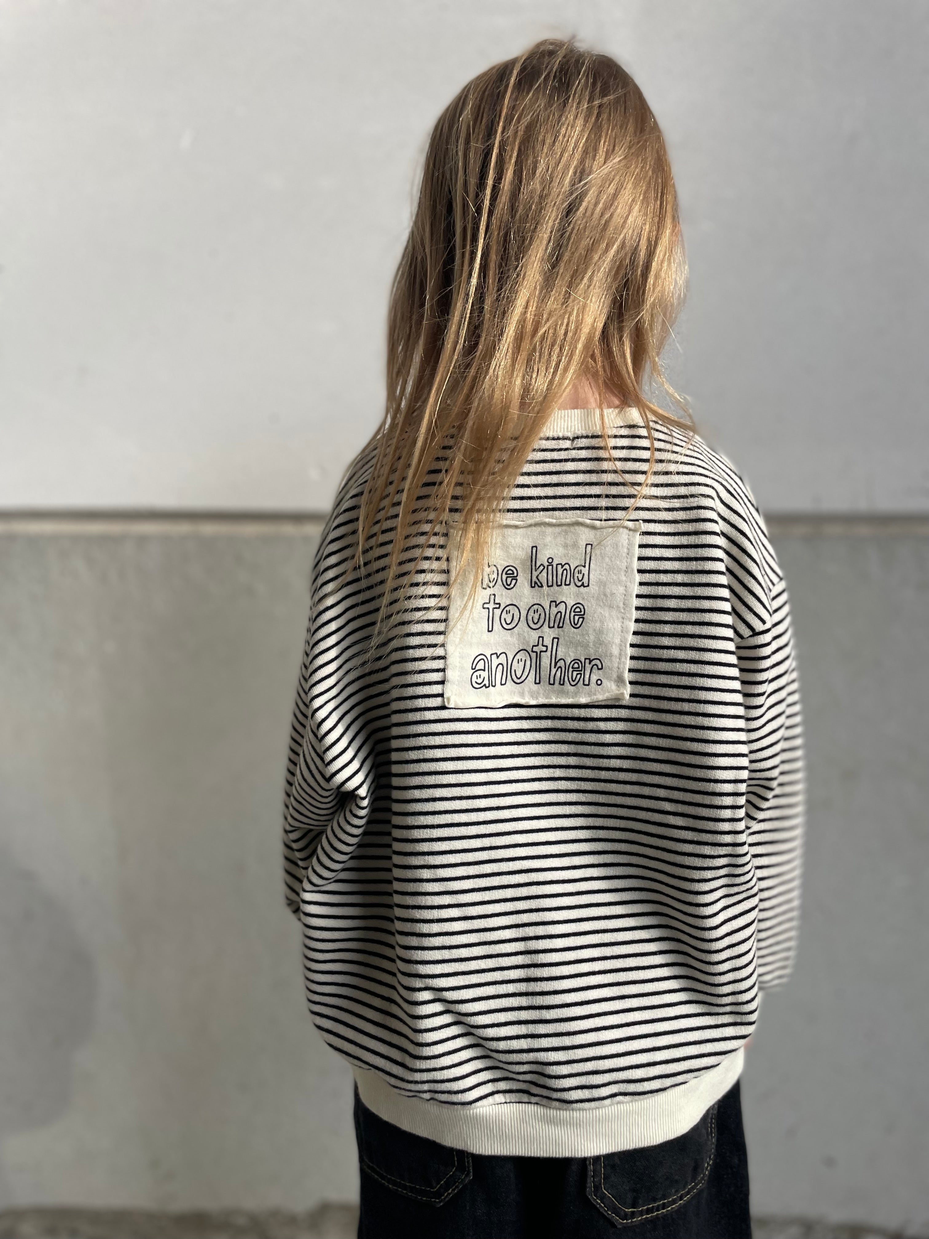 Deze heeft Lucie ook al helemaal ingepalmd! Een superfijn oversized gestreept sweatertje met mooie smiley quote op de rug. Be kind to one another