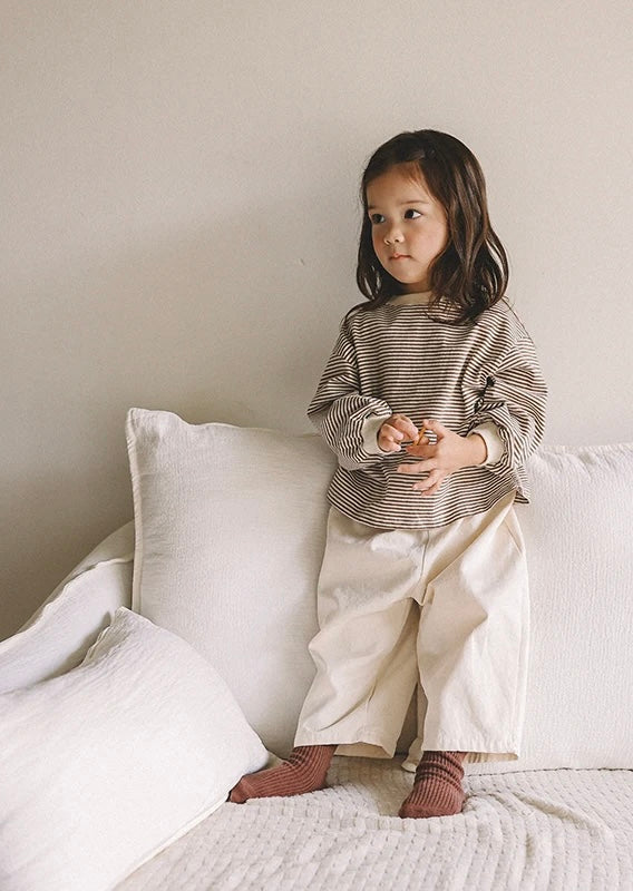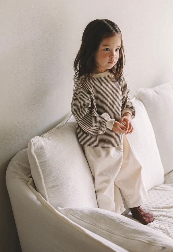 Een prachtige katoenen gestreepte t-shirt met lange mouwen. Elastische ivoorkleurige hals en mouwuiteinden, oversized fit.
