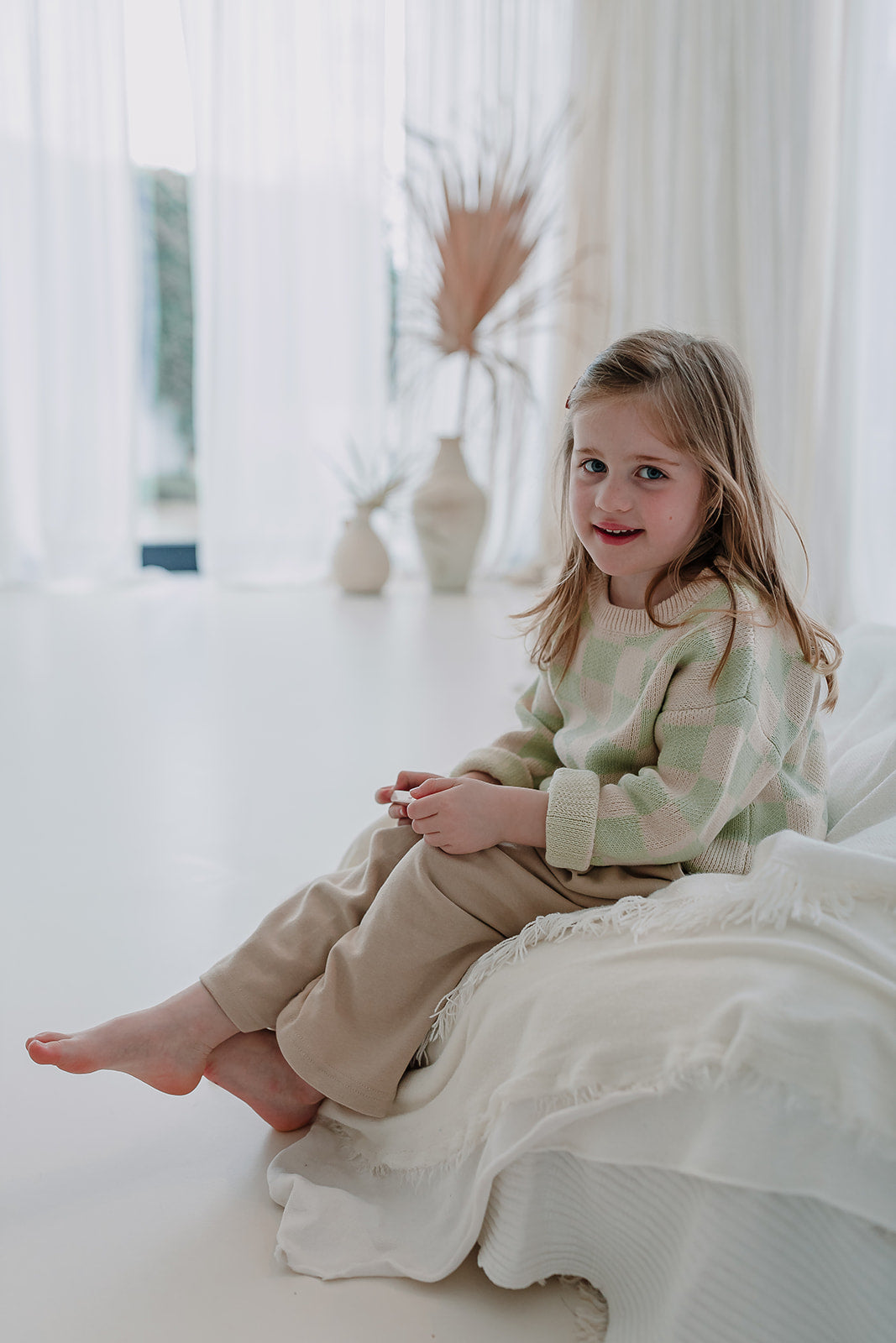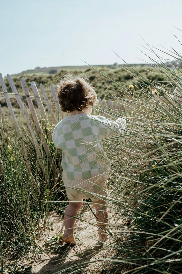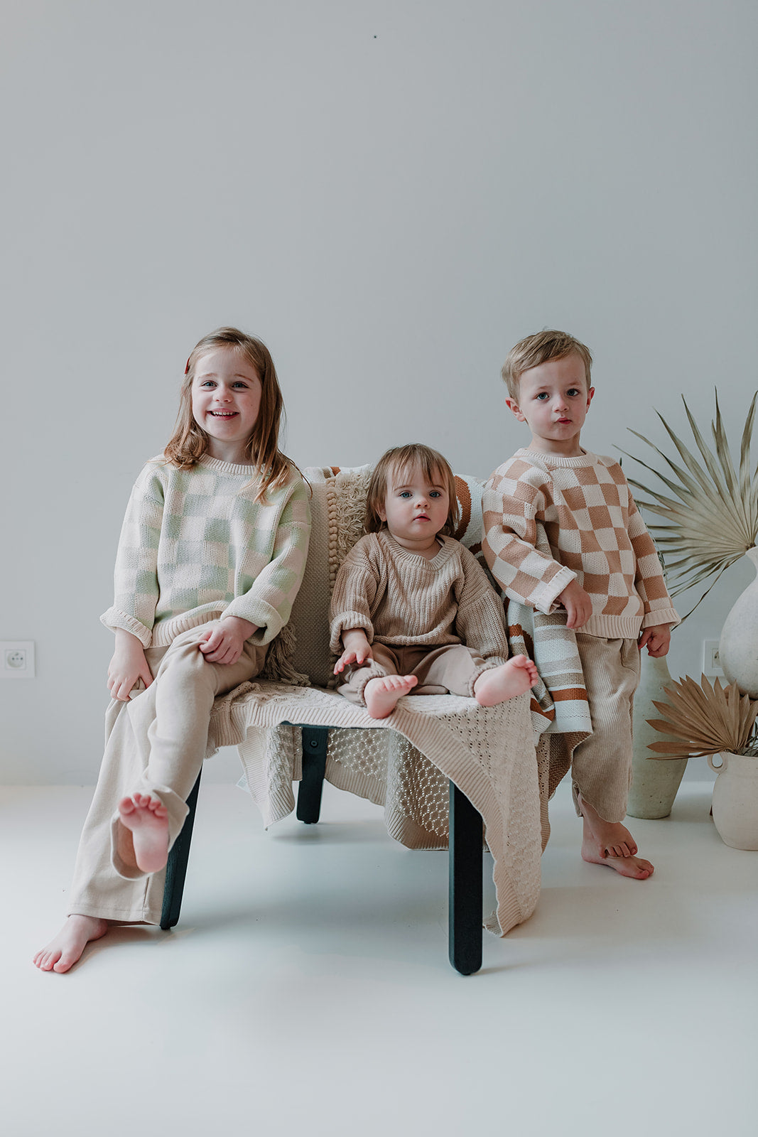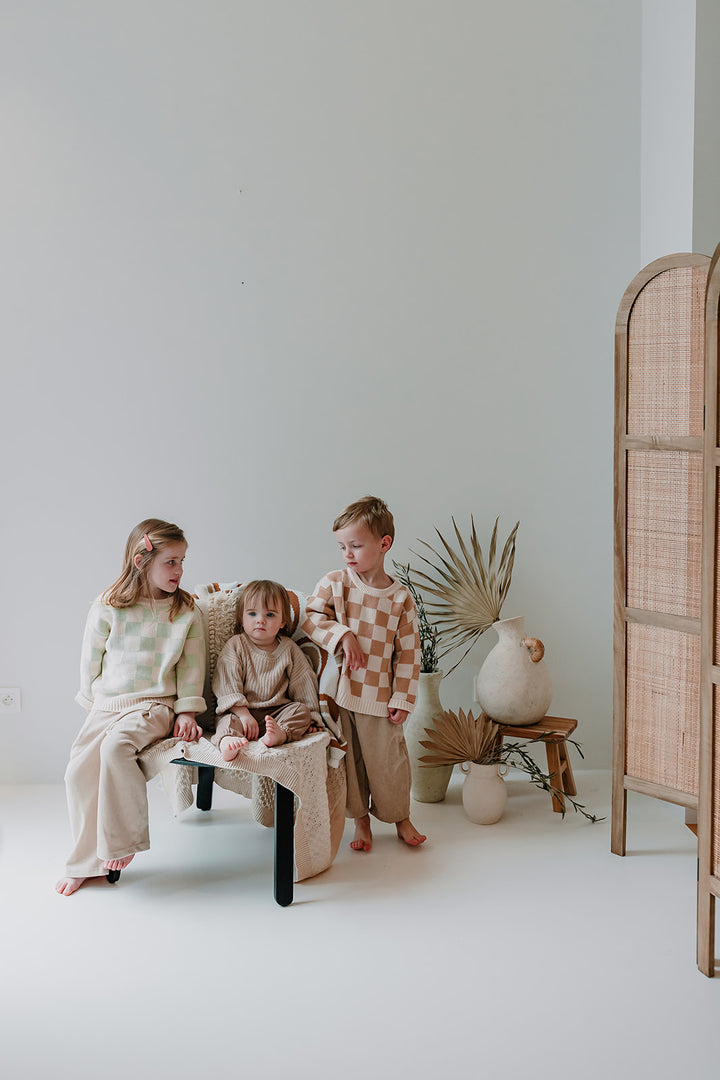 Lucie is op de foto 16 maanden en draagt maatje 12-18 maanden. Arthur is op de foto 3,5 jaar en draagt de organic sweater met bruine ruitjes in maat 3-4 jaar en Alice is 4,5 jaar en draagt ook de organic sweater met ruitjes maar dan in het groen in maat 4-5 jaar. Gemaakt van 100% biologisch katoen.