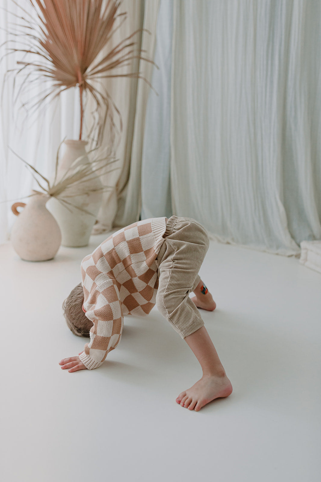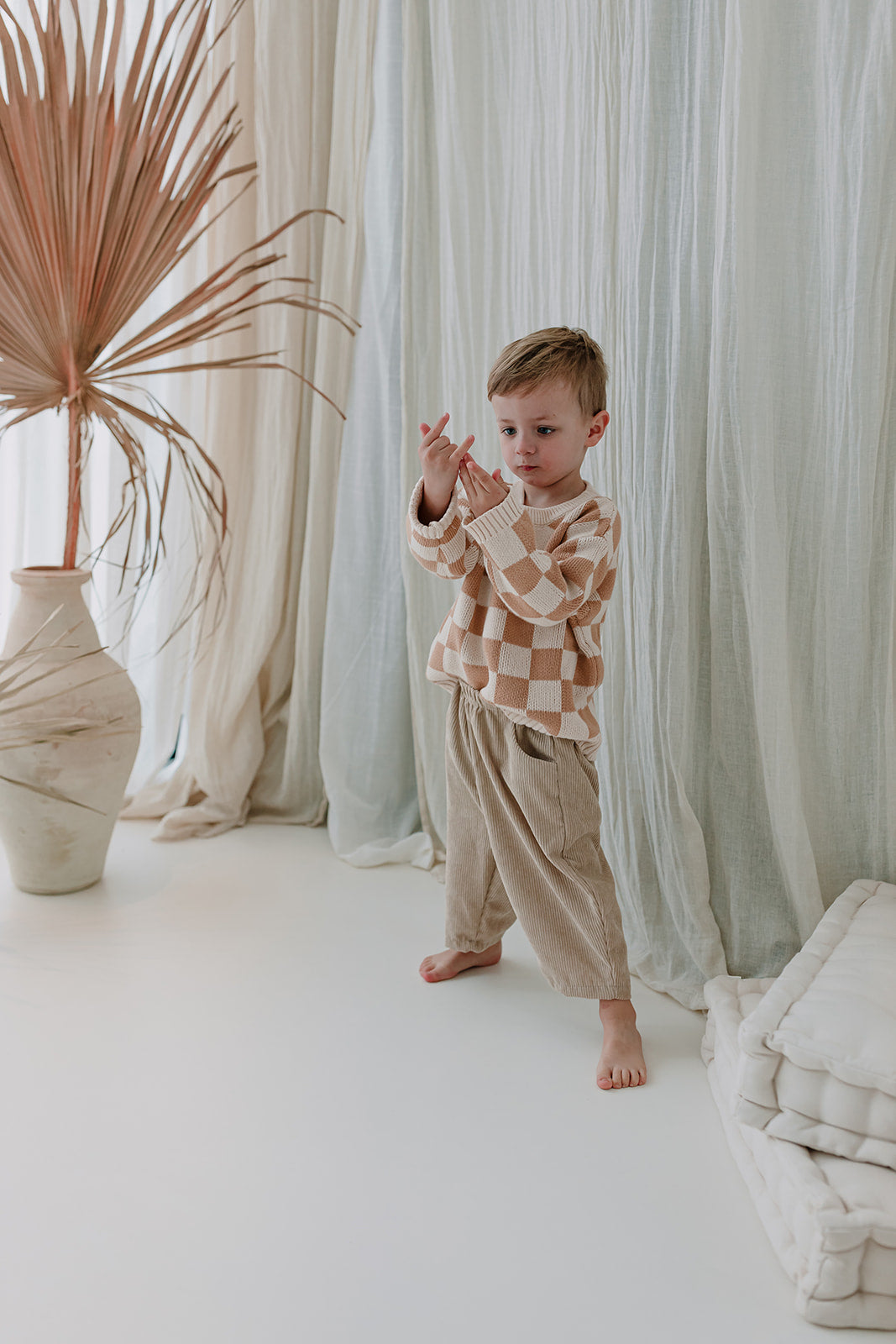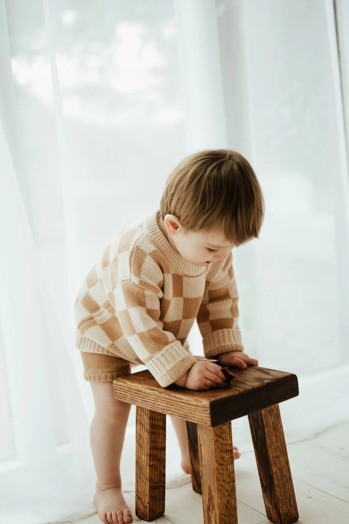 Lucie is op de foto 16 maanden en draagt maatje 12-18 maanden. Arthur is op de foto 3,5 jaar en draagt de organic sweater met bruine ruitjes in maat 3-4 jaar en Alice is 4,5 jaar en draagt ook de organic sweater met ruitjes maar dan in het groen in maat 4-5 jaar. Gemaakt van 100% biologisch katoen.