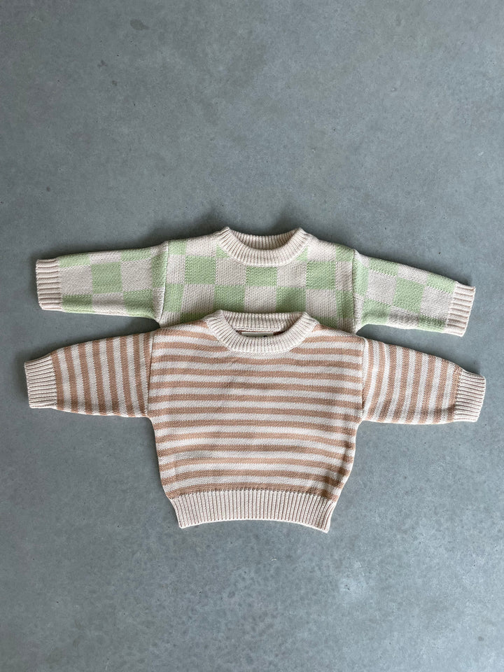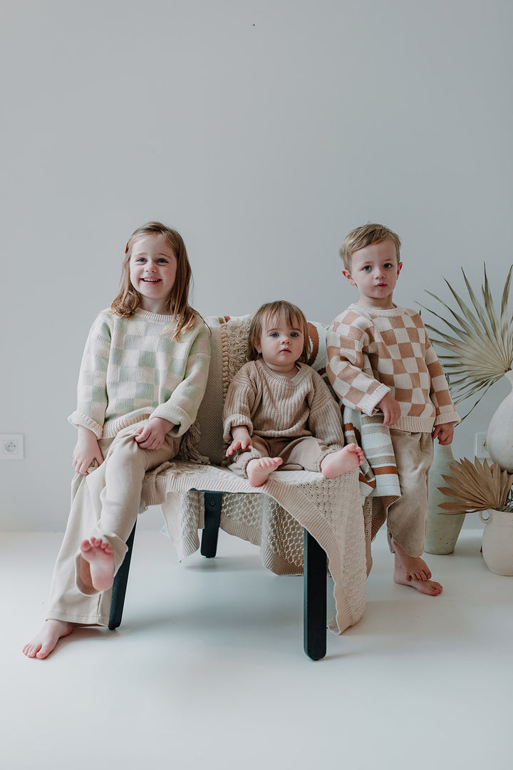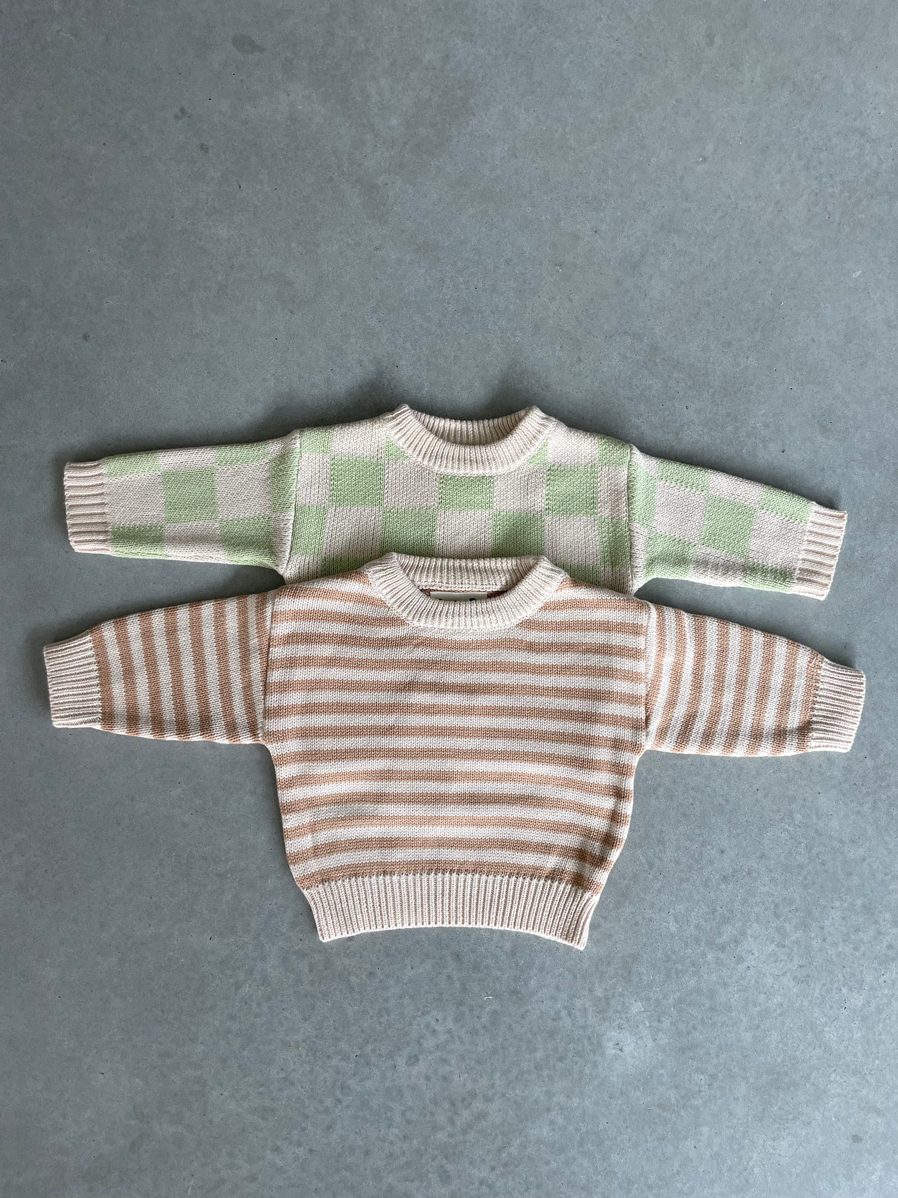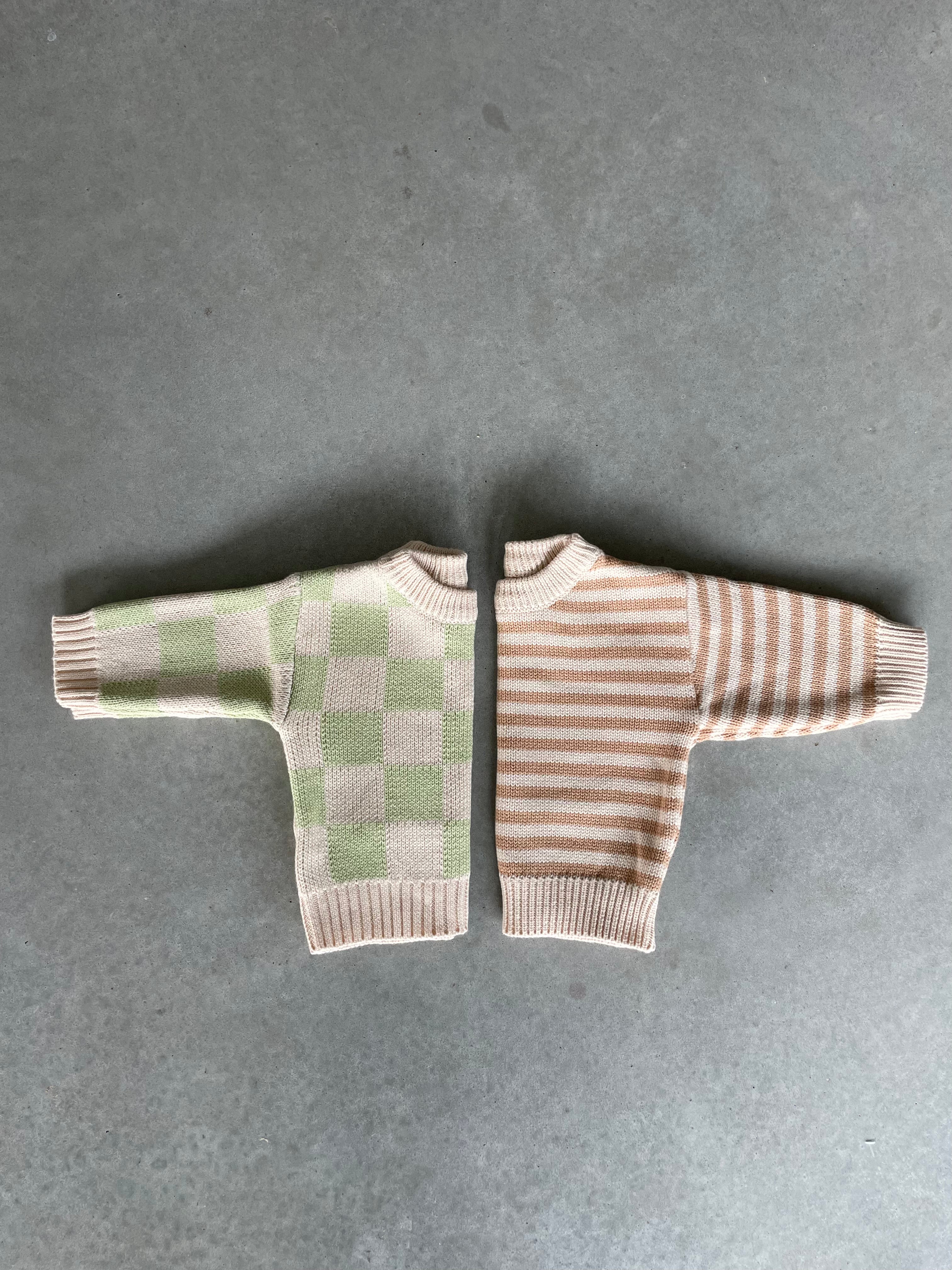 Nieuwe mooie sweaters van hetzelfde merk van onze mooie oversized gebreide trui, alleen zijn deze gebreide truien wat fijner gehaakt. Voor de rest zijn ze even mooi, warm en speels als onze gekende oversized truitjes! Ga voor de bruine streepjes of de lichtgroene ruitjes. Van newborn tot en met 5 jaar.