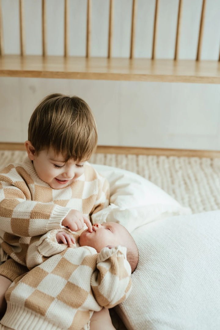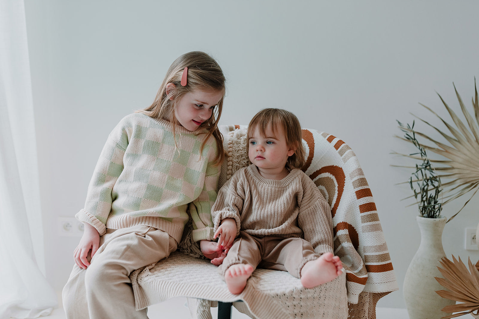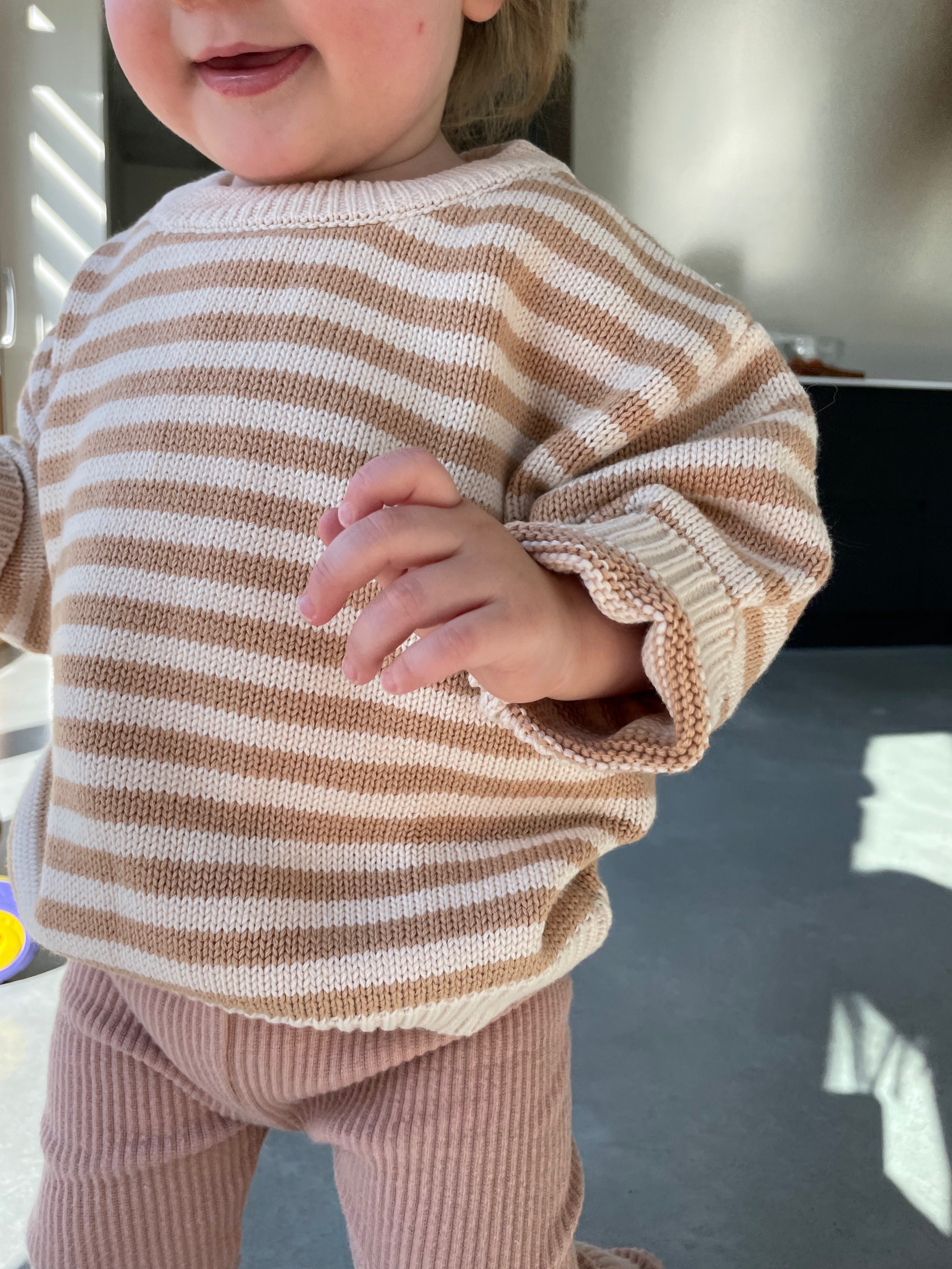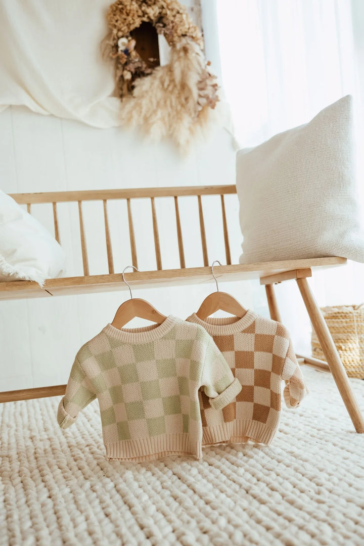 Nieuwe mooie sweaters van hetzelfde merk van onze mooie oversized gebreide trui, alleen zijn deze gebreide truien wat fijner gehaakt. Voor de rest zijn ze even mooi, warm en speels als onze gekende oversized truitjes! Ga voor de bruine streepjes of de lichtgroene ruitjes. Van newborn tot en met 5 jaar.