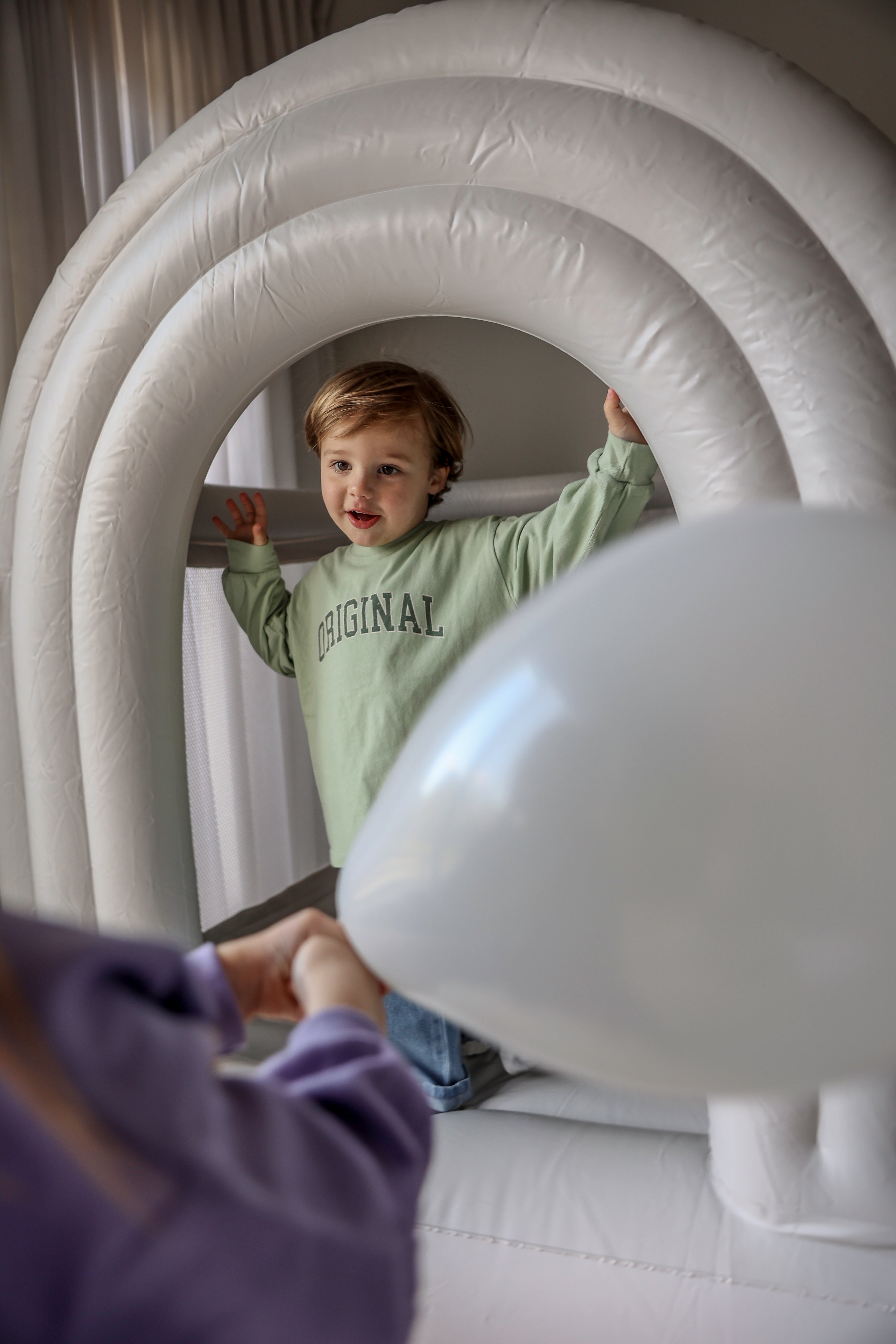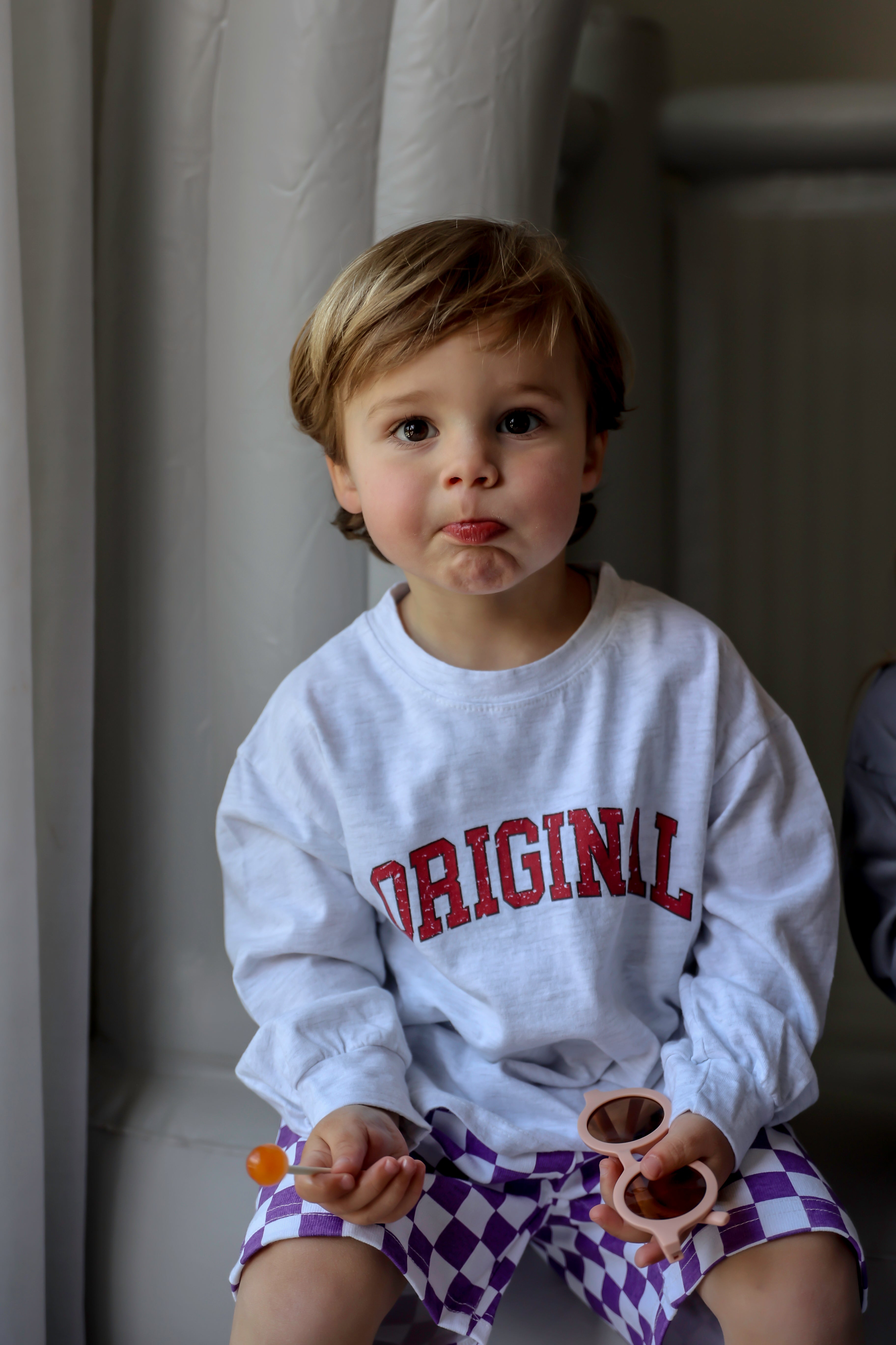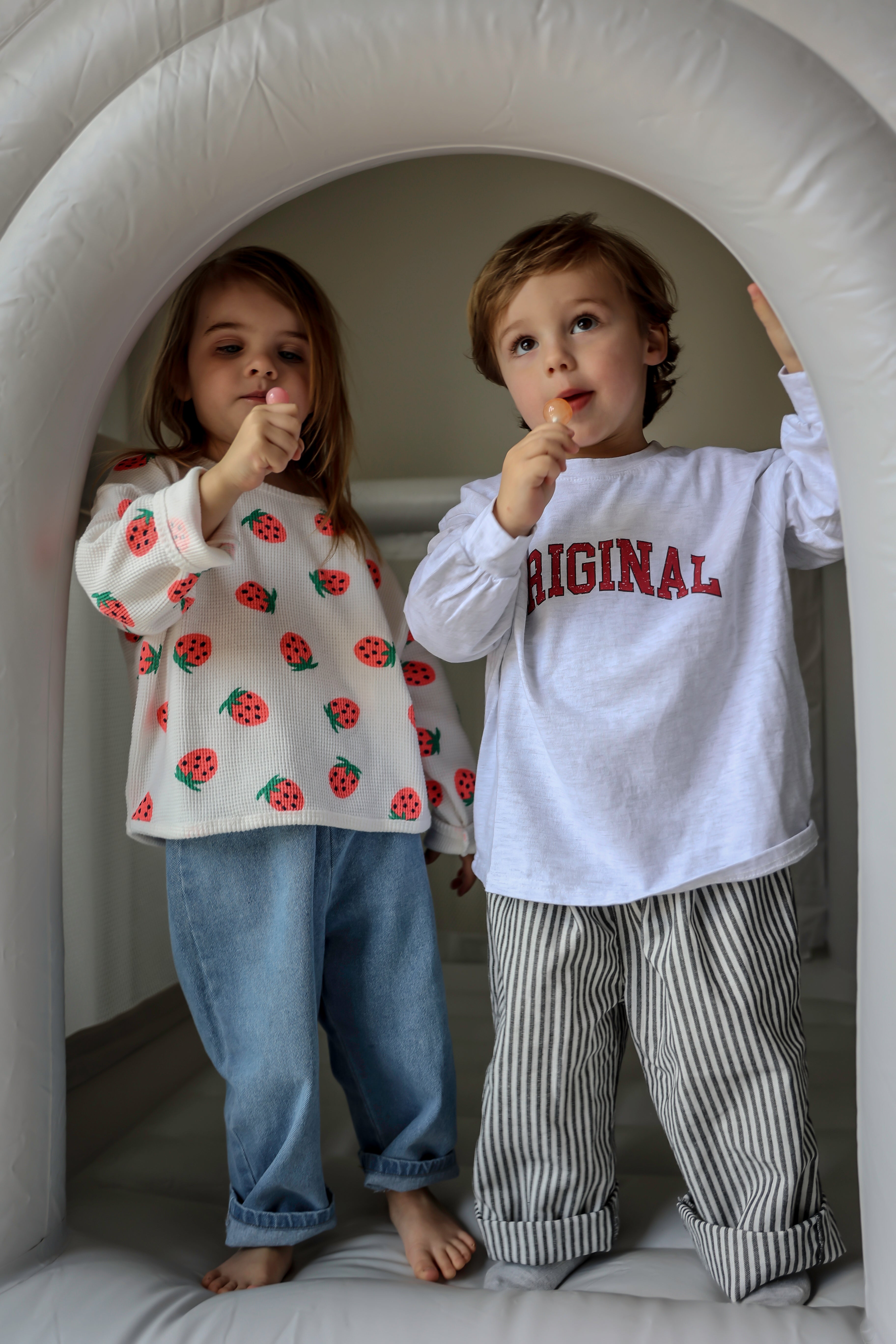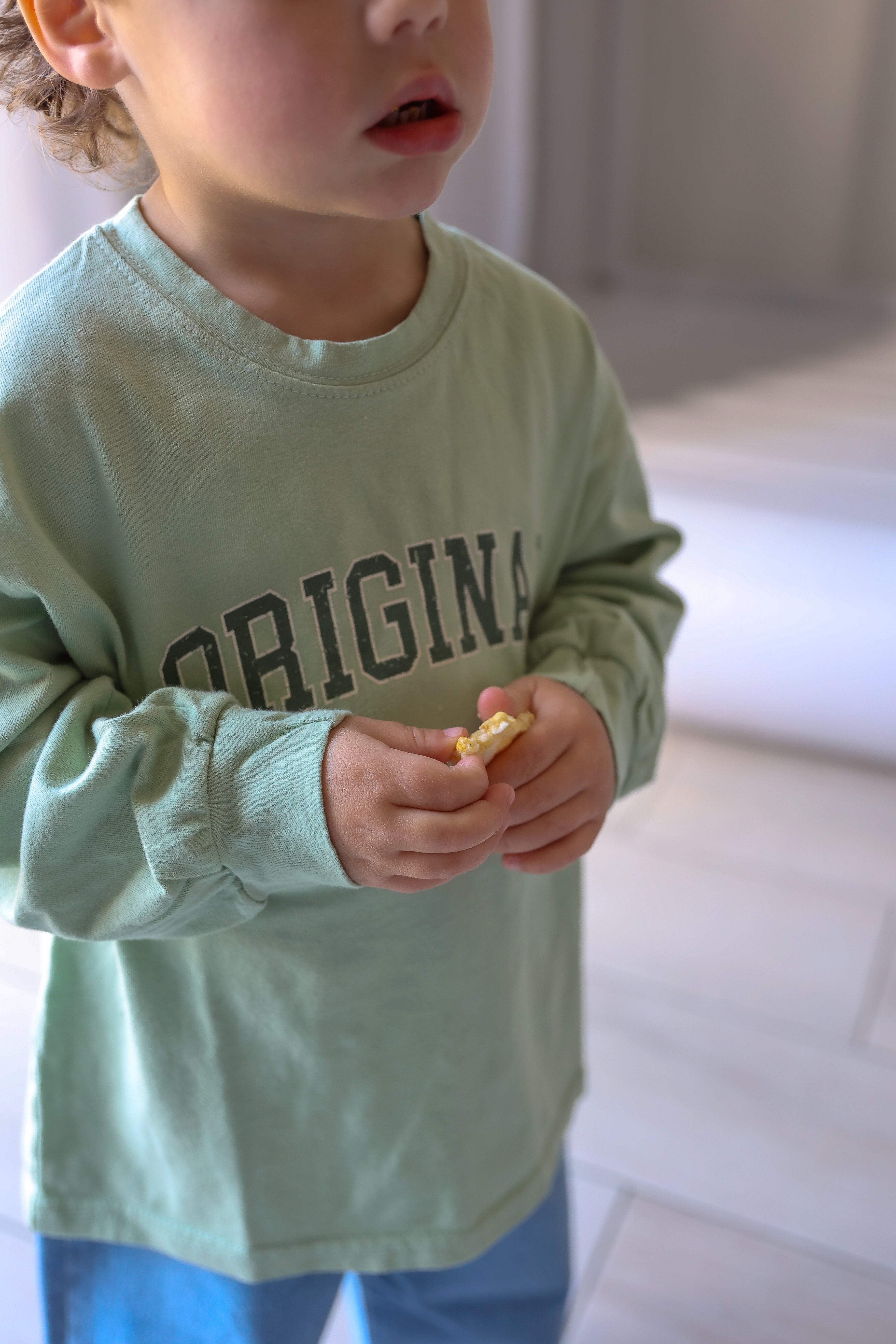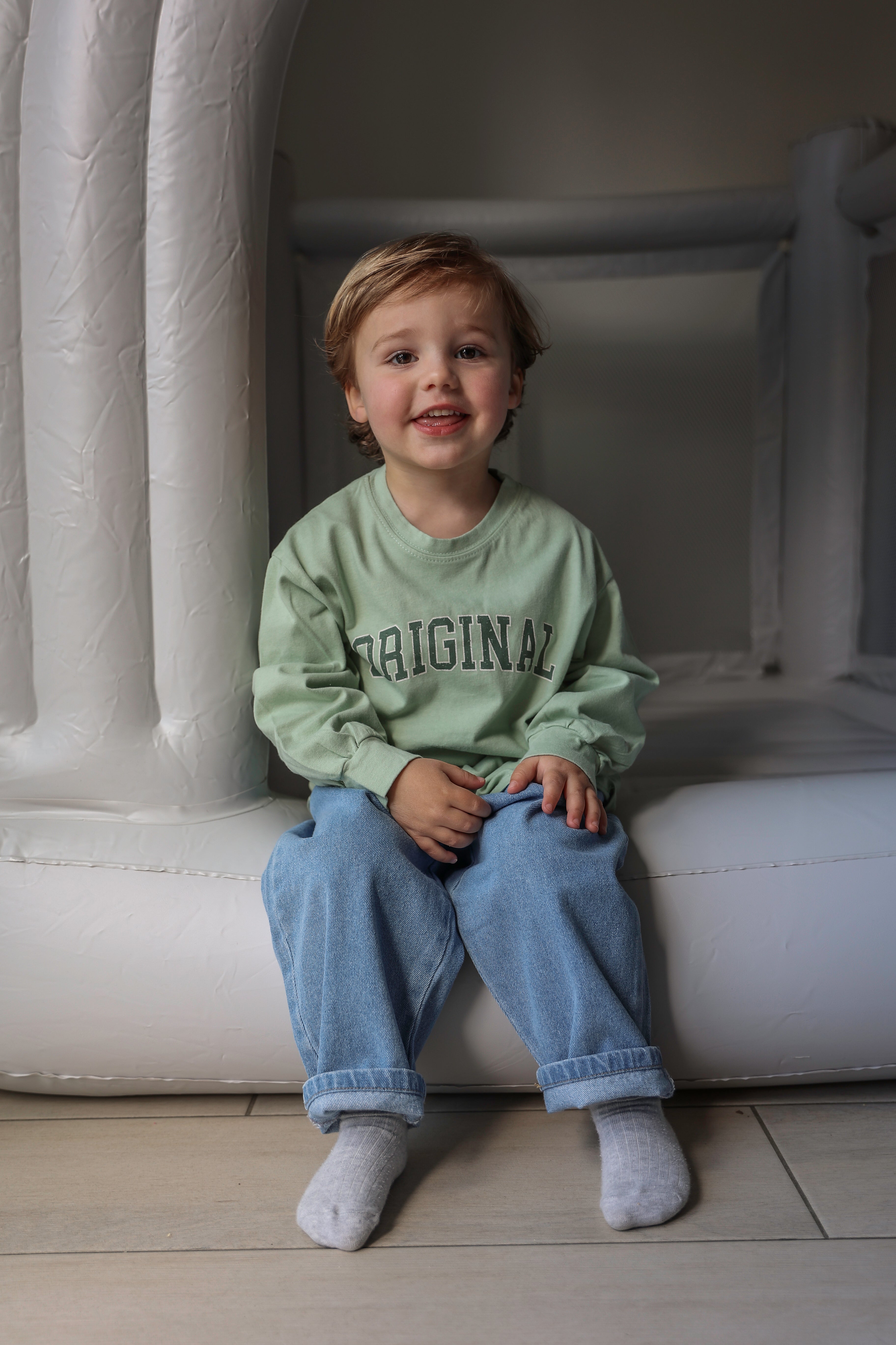 Coole original t-shirts met lange mouwen. Voor kids van 2 tot 10 jaar, in lichtgroen en lichtgrijs. Dunne t-shirtstof. Manù-Joe is op de foto 3 jaar en draagt in beide kleuren maat M