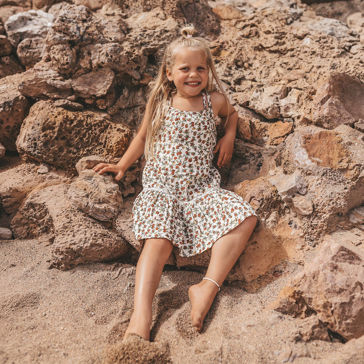 Dé fruitprint van het seizoen: de granaatappel! Een zalig, speels en comfortabel zomerkleedje! Het jurkje heeft een zachte, licht gestructureerde ademende stof. De mooie print is ontworpen door de eigen designers van het Nederlandse merk Salted Stories.