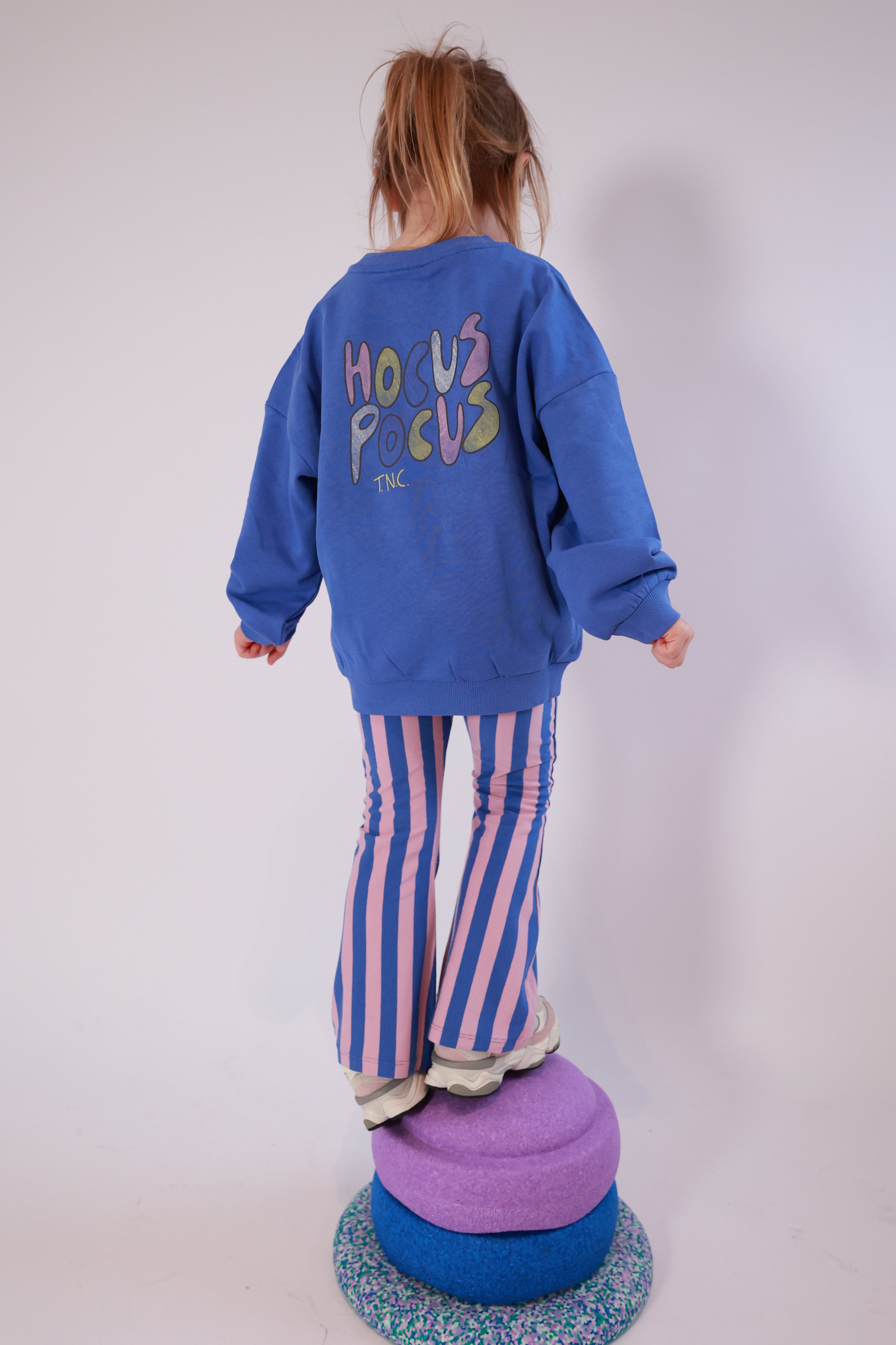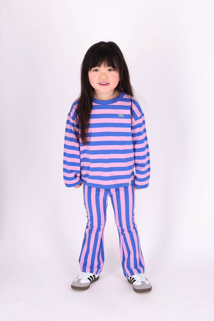 Deze flared broek met speelse verticale strepen is een echte eyecatcher. De zachte, elastische tailleband zorgt voor extra comfort, terwijl de uitlopende pijpen een trendy en speelse look geven. Perfect om in te bewegen, dansen en stralen!